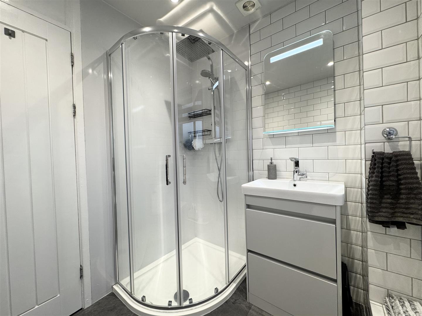 This contemporary shower room is fitted with a quadrant shower enclosure equipped with a waterfall shower, a gloss white vanity unit with drawers for storage and an integrated handwash basin with mixer tap and a matching low level WC. The room is fully tiled with white metro tiles and co-ordinating aquaboards to the shower area. Dark grey tile effect laminate flooring runs underfoot. A graphite grey heated towel radiator and an illuminated mirror complete the room. An obscure window allows natural light to enter and a door leads to the landing.