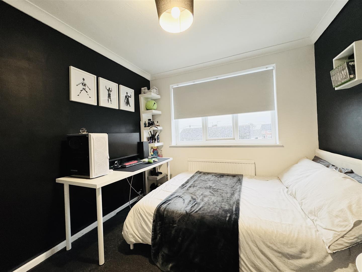 Located to the front of the property, this good sized double bedroom is beautifully presented with a feature wall and low hanging beside lights. There is ample space for freestanding bedroom furniture. A door leads to the landing.
