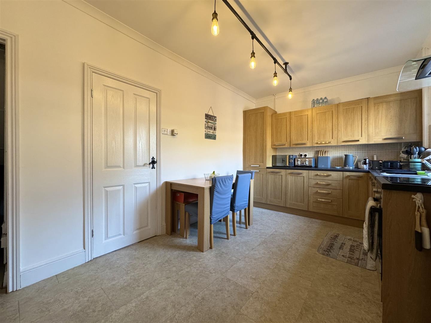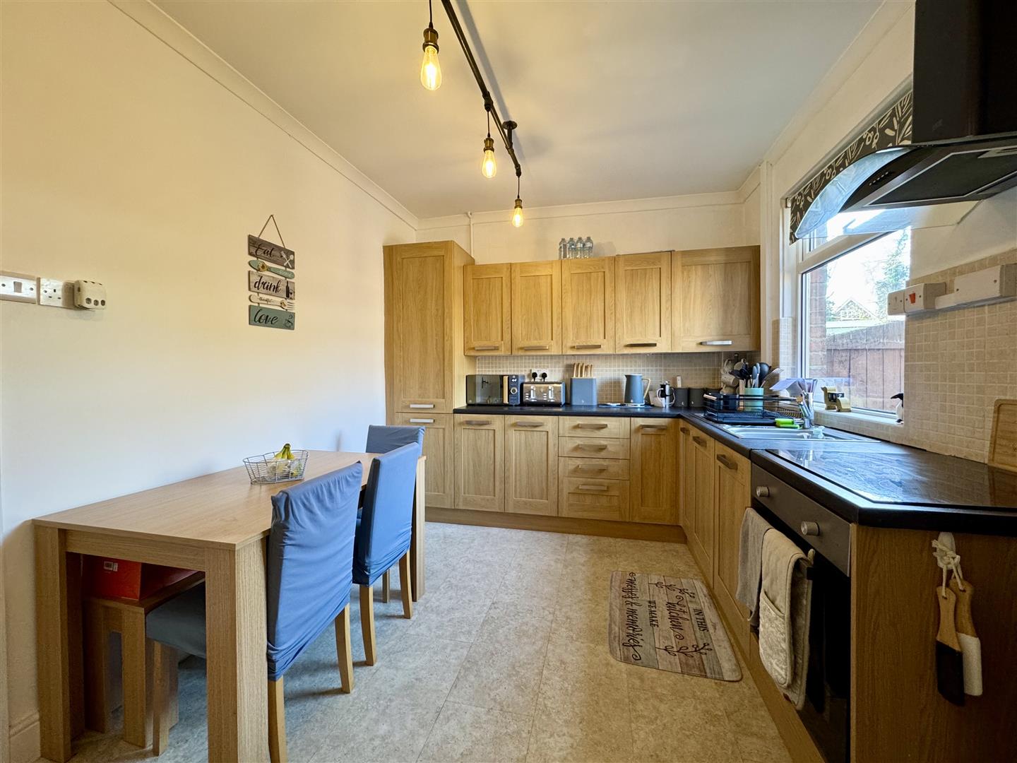 Positioned to the rear of the property and spanning the full width of the house is this large dining kitchen. Fitted with wood effect wall and base units, roll top work surfaces, tiled splash backs and a stainless steel sink and drainer with mixer tap, this kitchen also benefits from an electric oven, four ring electric hob, extractor fan, and space for freestanding appliances. There is plenty of room for a dining table and chairs, a window looks out over the garden and there is tile effect flooring. Doors lead to the lounge, rear entrance hall/utility area and the understairs cupboard which offers handy storage for household items.