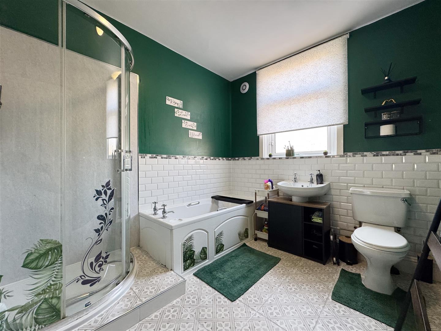 Comprising a four piece white suite including corner shower cubicle, bath, pedestal hand wash basin and low level W.C, this extremely spacious bathroom is partially tiled, has an obscure glazed rear facing window and tiled flooring. A door leads to the landing.
