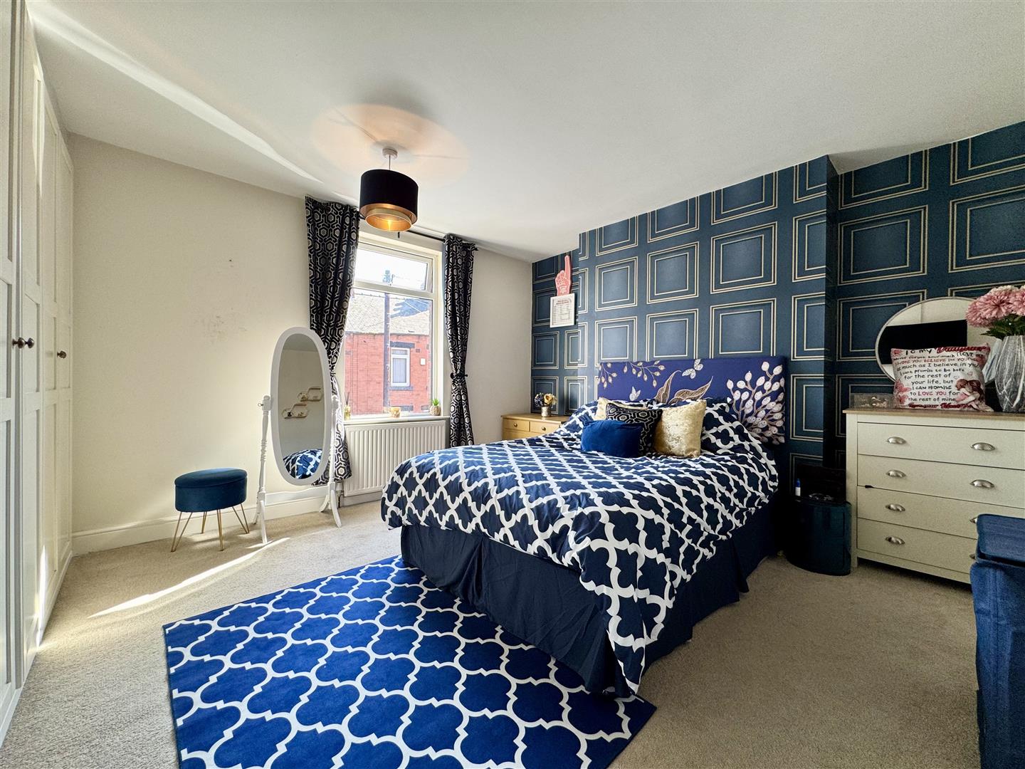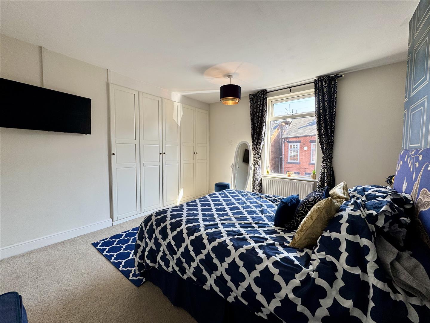 This generously sized king size bedroom offers an abundance of space for bedroom furniture items in addition to a bank of fitted wardrobes. There are alcoves either side of the chimney breast, a front facing window provides light and a street scene view, and a door leads to the landing.
