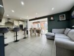Just flooded with natural light from glazing to dual aspects, this stunning living dining kitchen really is the heart of the home and is spacious enough to accommodate not only kitchen and dining but a lounge area too. The kitchen area is fitted with a range of cream gloss base and wall units with wood effect laminate worktops and upstands and an inset stainless steel sink with mixer tap. Cooking facilities comprise of a six burner gas hob and a double electric oven. Integrated appliances include a fridge freezer and dishwasher. A breakfast bar offers an informal dining solution. There are pale grey ceramic floor tiles underfoot and spotlights to the ceiling completing the look. A fabulous bay window with French doors giving access to the garden, provides the perfect spot for a good sized dining table. Doors lead to the entrance hallway and utility room.