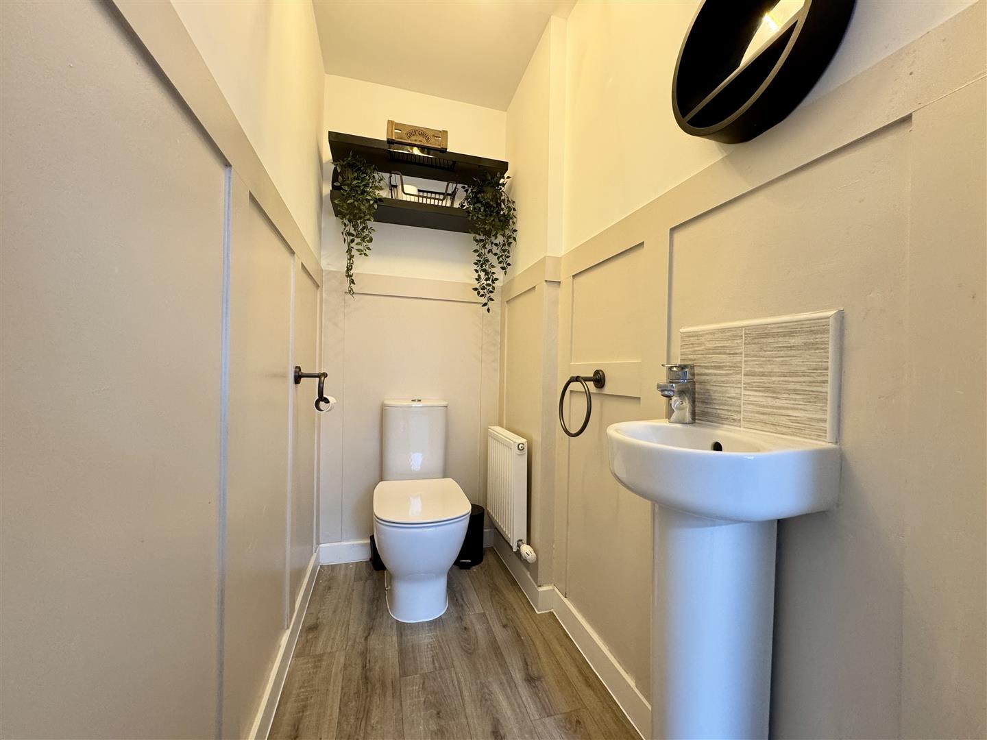 This downstairs W.C. is fitted with a white low level W.C. and a pedestal wash basin. There is a tiled splashback and wood effect vinyl flooring underfoot.