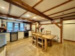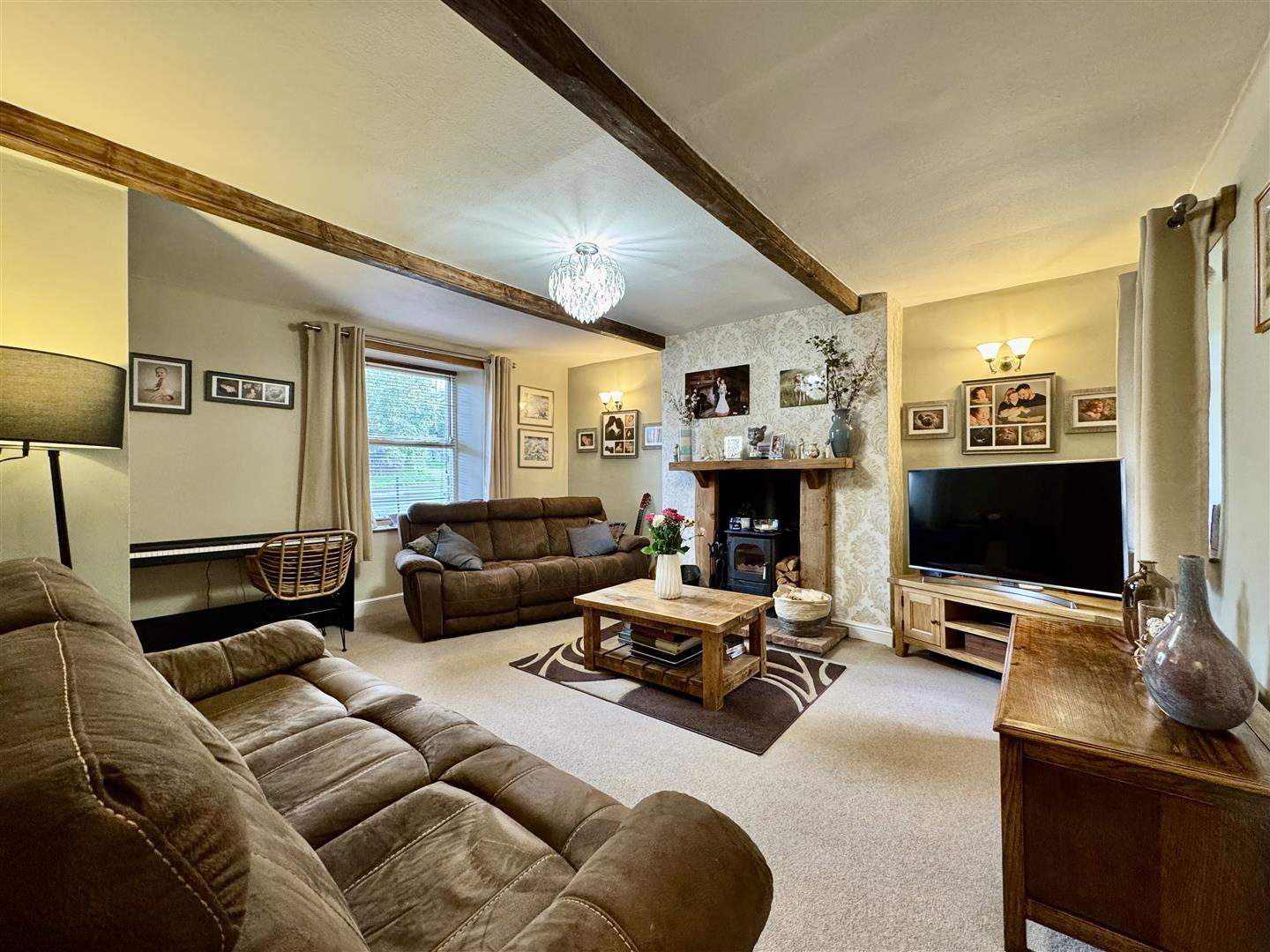 This spacious living room can comfortably house a range of freestanding furniture and has a charming timber fireplace with a tile hearth housing a multi fuel stove which creates a lovely focal point. The room has dual aspect windows allowing natural light to flood in and characterful beams to the ceiling. Doors lead to the rear stairs and back through to the entrance hall.