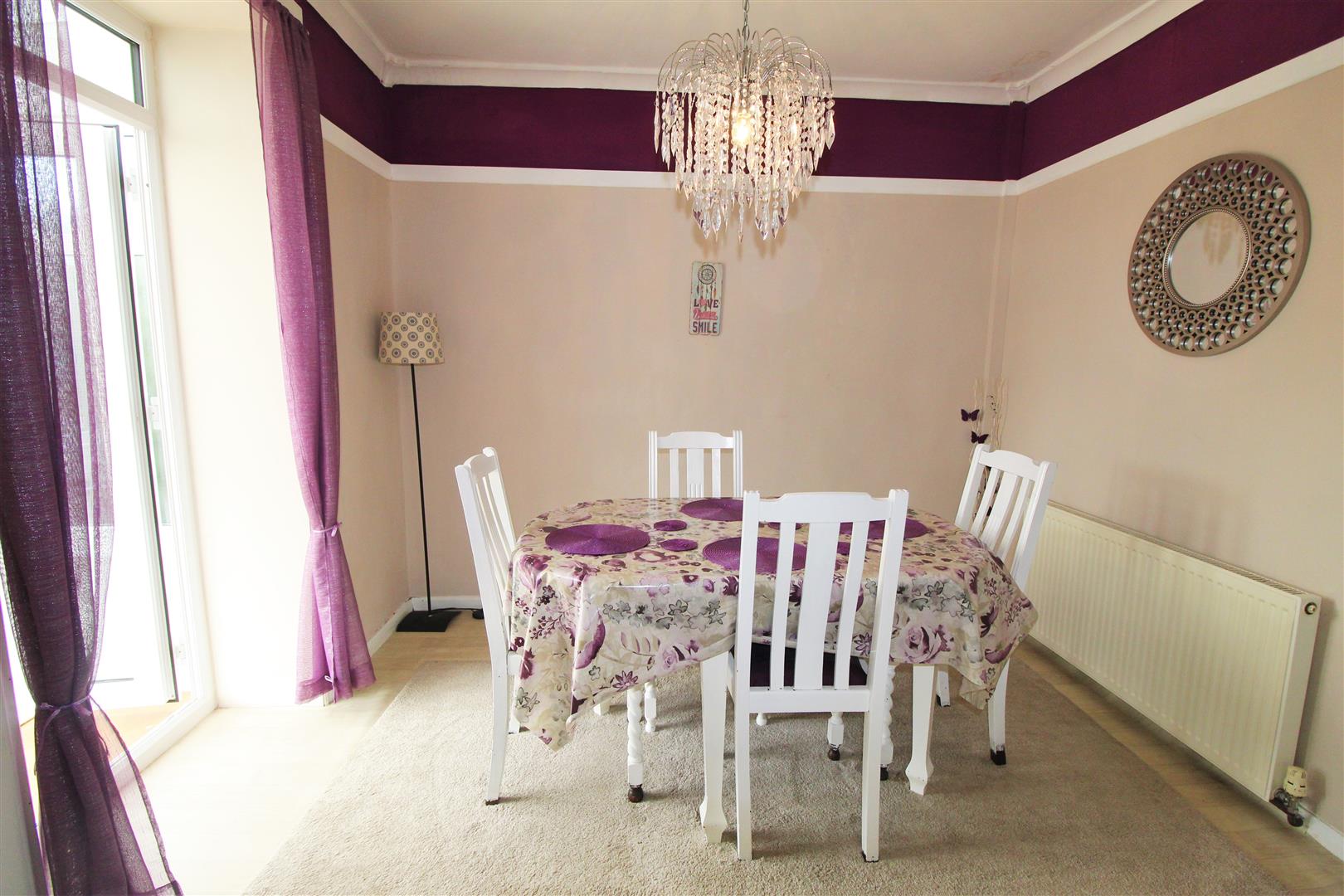 Located off the kitchen, this formal dining room has space for furniture. There is vinyl flooring underfoot and doors lead to the conservatory, lounge and kitchen.