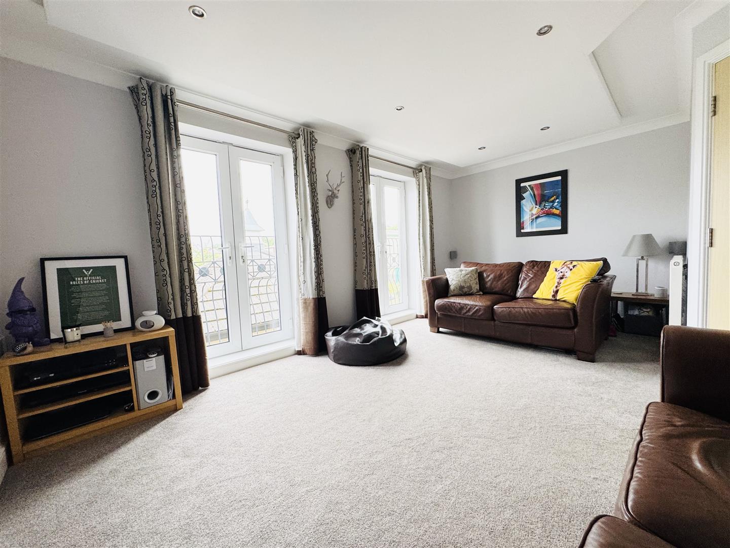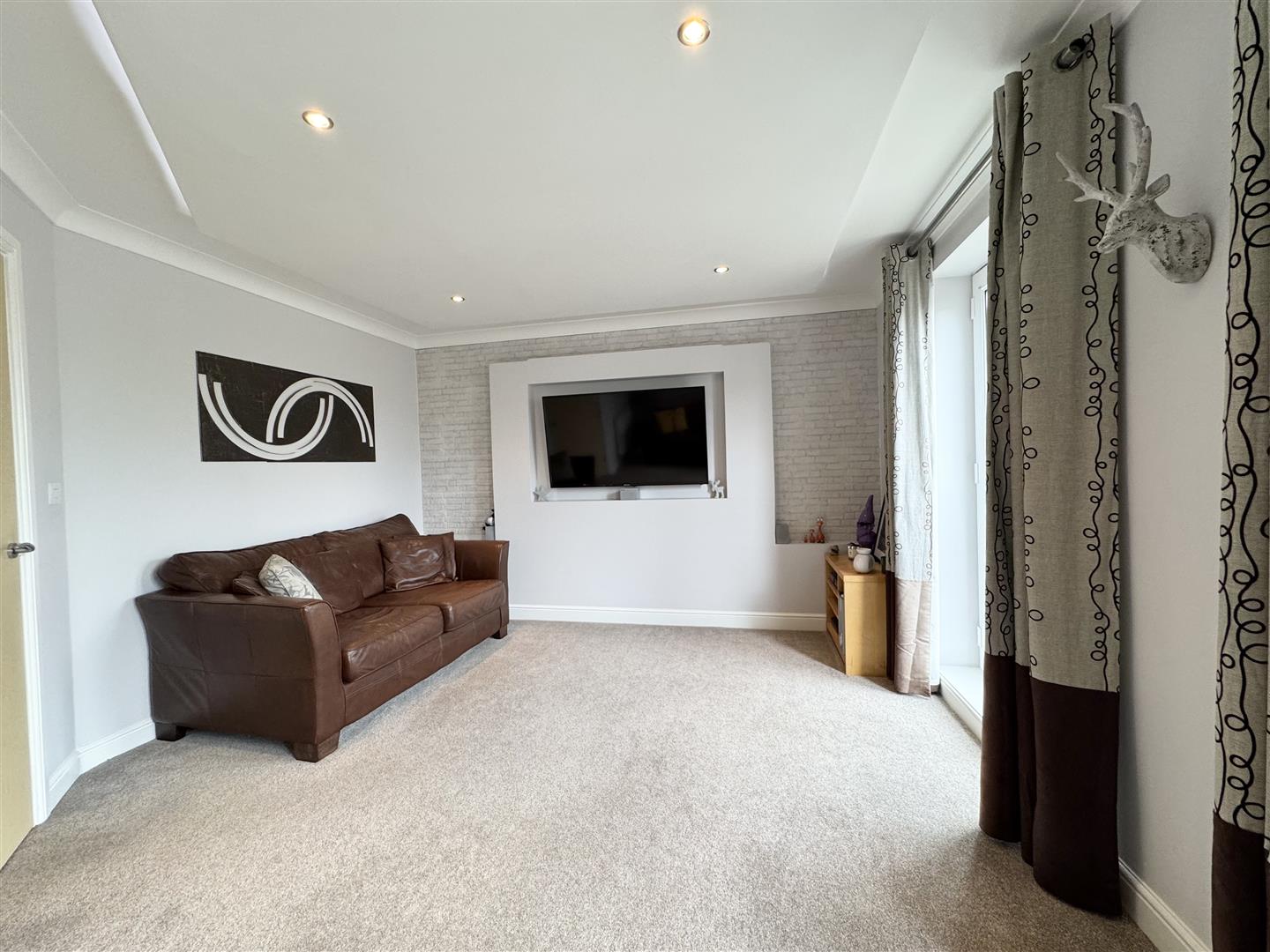 Located to the front of the property, this lovely generous sized lounge has light simply flooding in courtesy of two sets of French doors with Juliet balconies. The room is tastefully decorated in neutral tones, with a media wall to one wall which has grey brick effect tiling as a feature, a suspended ceiling with spotlights and carpet underfoot. A door leads to the landing.