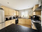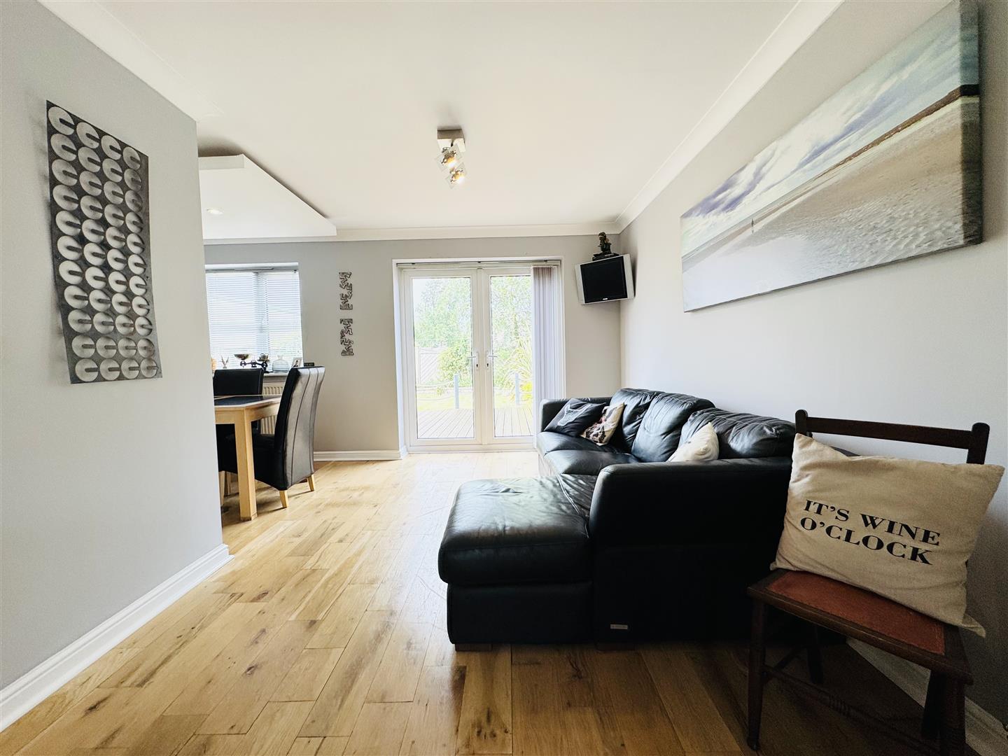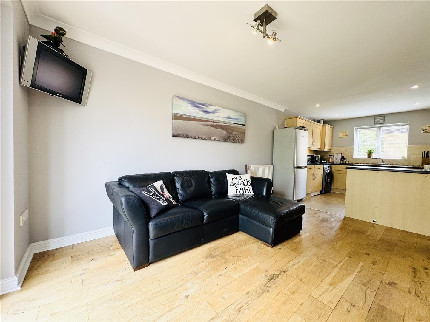 Located to the front of the property with a window looking out to the drive and garage and extending from the living dining room, this fantastic well appointed kitchen is fitted with maple effect shaker style kitchen units, black roll top laminate worktops, beige tiled splashbacks and a one and a half bowl stainless steel sink and drainer with mixer tap. Cooking facilities comprise of a four burner gas hob with a stainless steel extractor fan over and a double electric oven. There are spaces and plumbing for a washing machine, dishwasher and room to accommodate a tall fridge freezer. Beige porcelain tiles run underfoot and there are spotlights to the ceiling. The kitchen area is open plan to the living dining room.