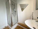 This contemporary ensuite shower room is fitted with a white suite comprising of a pedestal hand wash basin with mixer tap, a matching white low-level flush WC and a step in shower enclosure equipped with a thermostatic mixer shower. The room is partially tiled with white tiles with decorative inset tiles adding interest. Solid wood flooring runs under foot and there are spotlights to the ceiling. A chrome heated towel rail completes the room. An obscure window allows natural light to enter and a door leads to the bedroom.
