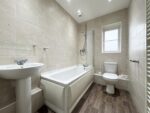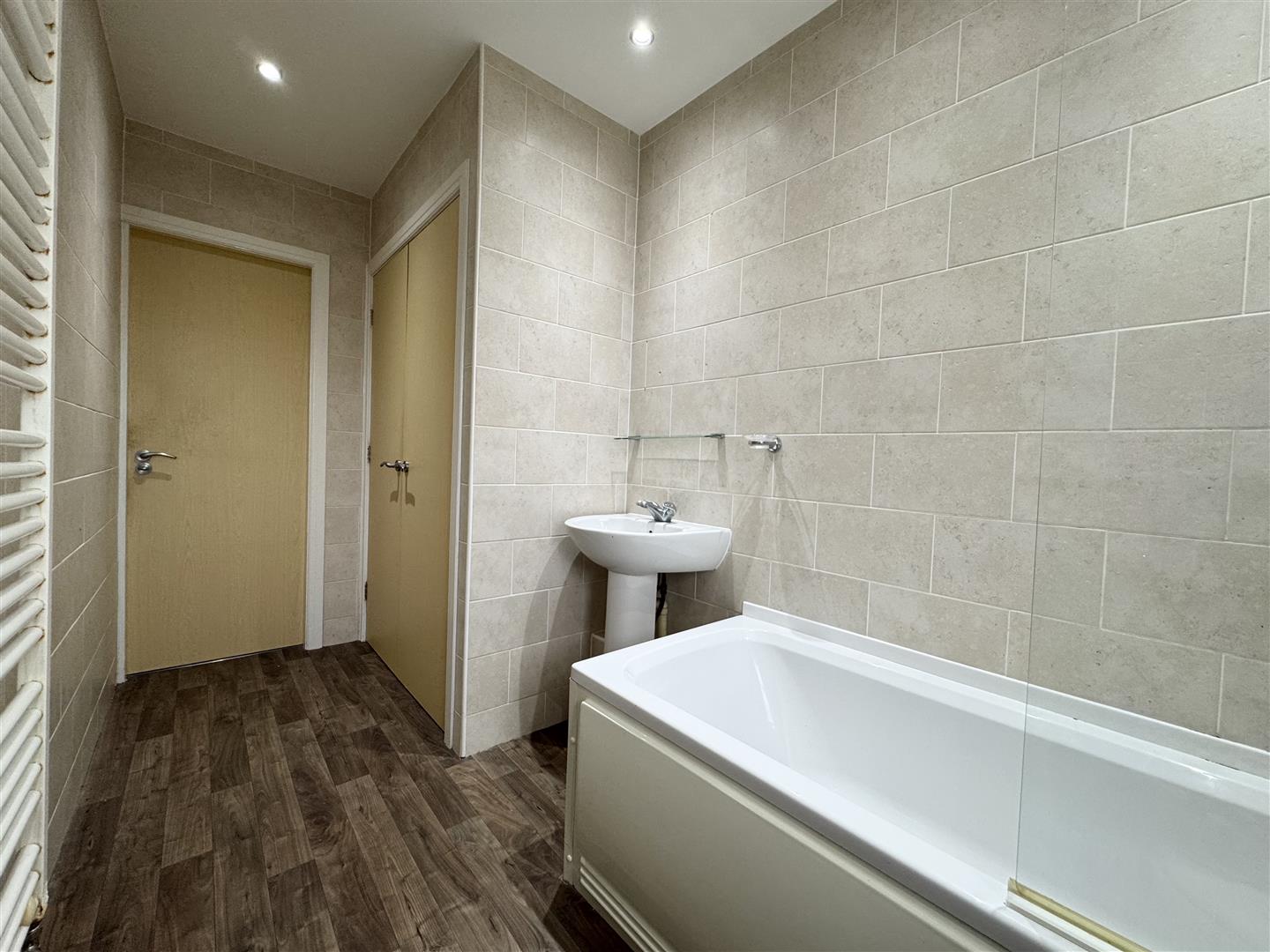 The bathroom is fitted with a three piece white suite comprising of a bath with shower over, pedestal hand wash basin and low level W.C. The bathroom is fully tiled in beige wall tiles and has spotlights to the ceiling. The room benefits from vinyl flooring, a heated ladder style towel rail and a large 2 door storage cupboard. An obscure glazed window faces the rear of the property and a door leads to the hallway.