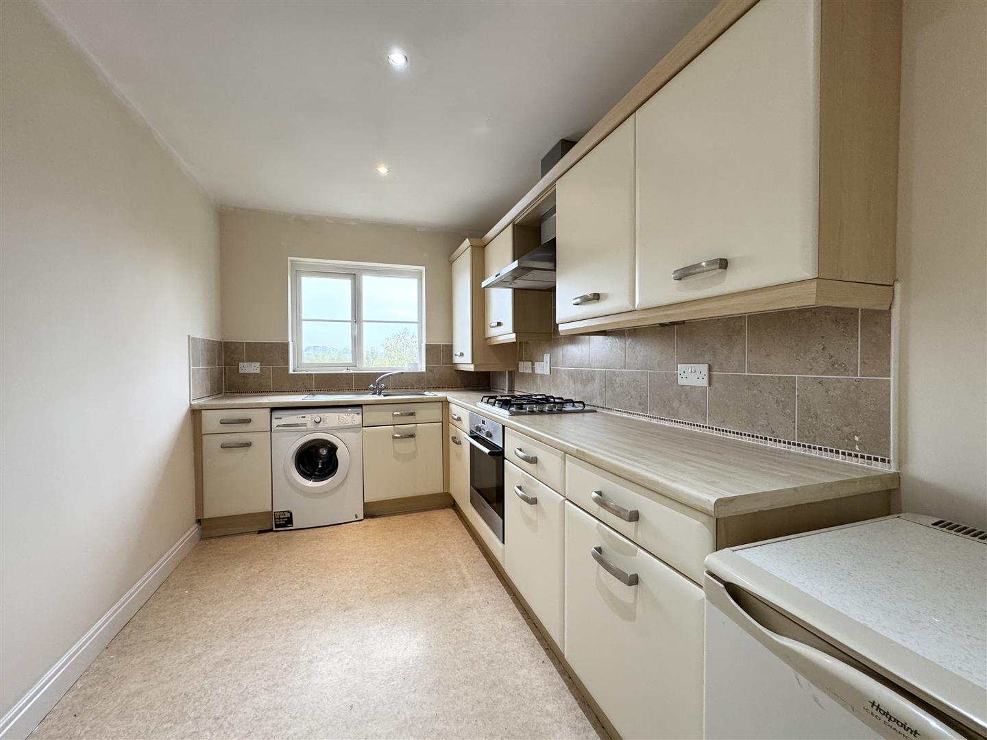 The kitchen is fitted with a range of cream and wood effect wall and base units, pale wood block style roll top work surfaces, tiled splash backs and a stainless steel sink and drainer with mixer tap over. Integrated appliances include a four ring gas hob and an electric oven. There are spaces for a fridge freezer and plumbing for a washing machine. The kitchen area has neutral décor, vinyl flooring underfoot and a window looking out over the communal garden to the rear of the property.