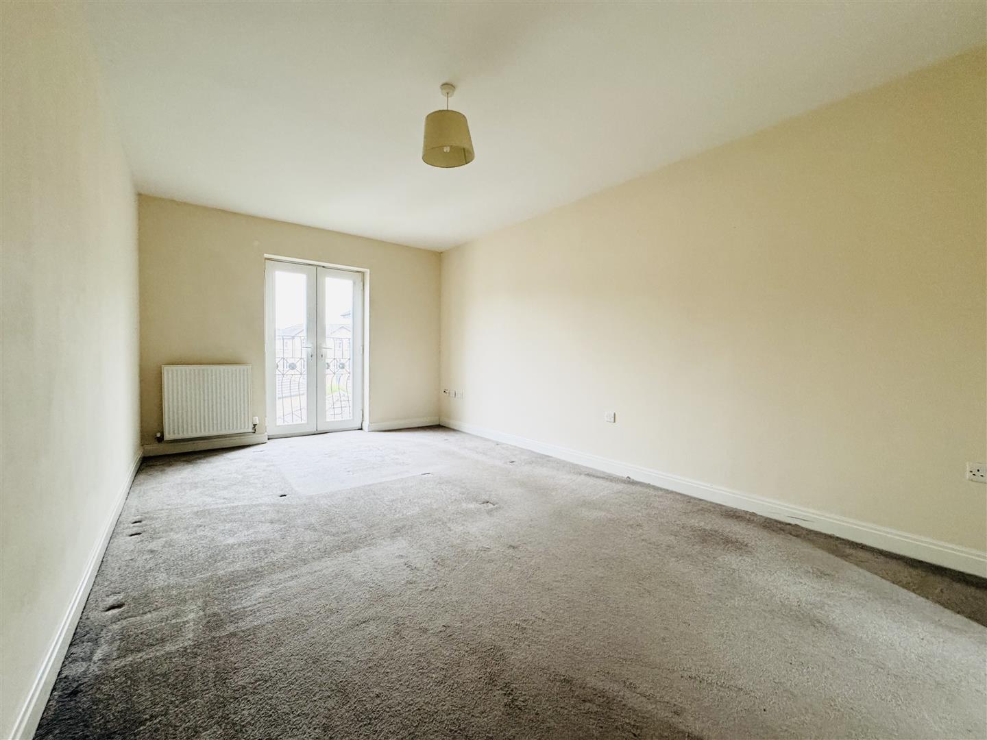 The living area has neutral décor with carpeted flooring and offers lots of space for free standing living room furniture whilst still allowing plenty of room to house a dining table and chairs. A set of patio doors with a Juliette balcony allows an abundance of light to enter. A door leads to the kitchen and hallway.