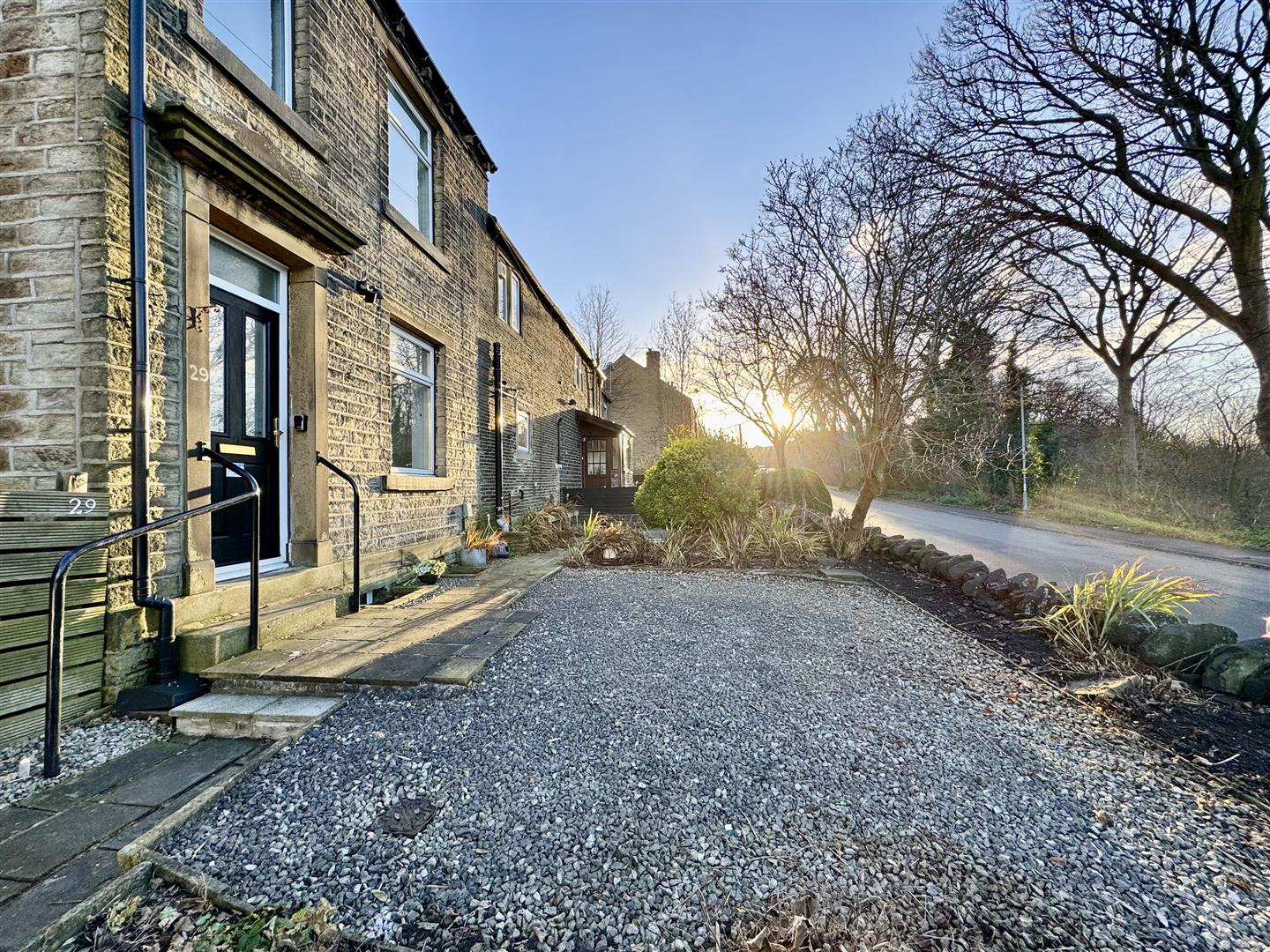 To the front of the property is a raised pebbled garden with plant bed borders, well established shrubs, bushes and trees.