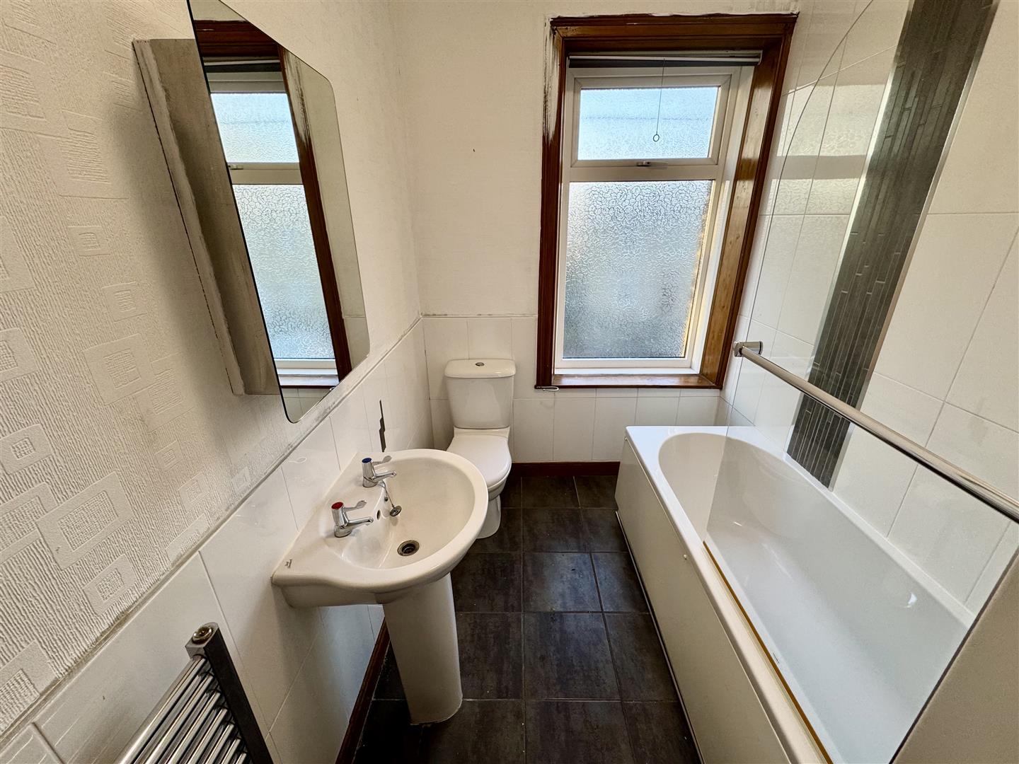 The bathroom features a three piece white suite comprising of a bath with shower over and glass screen, low level W.C, pedestal hand wash basin and a chrome towel radiator. The room is partially tiled with attractive wall tiles, complimentary tile flooring and a door leads onto the landing.