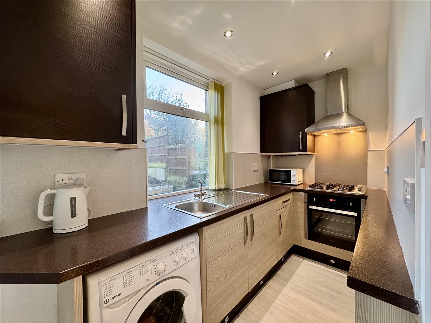 This stylish kitchen is fitted with a range of modern wall and base units with undercounter lighting, roll top work surfaces with upvc splash backs and a stainless steel sink with mixer tap over. Integrated appliances include an electric oven and four ring gas hob with extractor above, a fridge and plumbing for a washing machine. Laminate flooring flows underfoot, spotlighting adorns the ceiling and doors lead through to the lounge, cellar steps and an external door opens out to the rear garden.