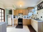 Spanning the rear of the property and enjoying views of the rear garden from a large window, this spacious dining kitchen is split into two distinct areas. The kitchen area is fitted with a range of limed oak base and wall units, beige marble effect laminate worktops, tiled splashbacks and a one and a half bowl stainless steel sink with mixer tap over. Appliances include a freestanding gas cooker with a concealed extractor fan over and a tall fridge freezer. A peninsula unit with a breakfast bar provides an informal dining solution. Vinyl flooring runs underfoot in the kitchen area and the dining portion of the room is carpeted. The dining area has an Inglenook fireplace with a stone hearth suitable for installing an electric stove. Alcoves to either side of the fireplace provide perfect places for freestanding items of furniture, one of these alcoves has built-in shelves. Doors lead to the entrance hallway and the utility room.
