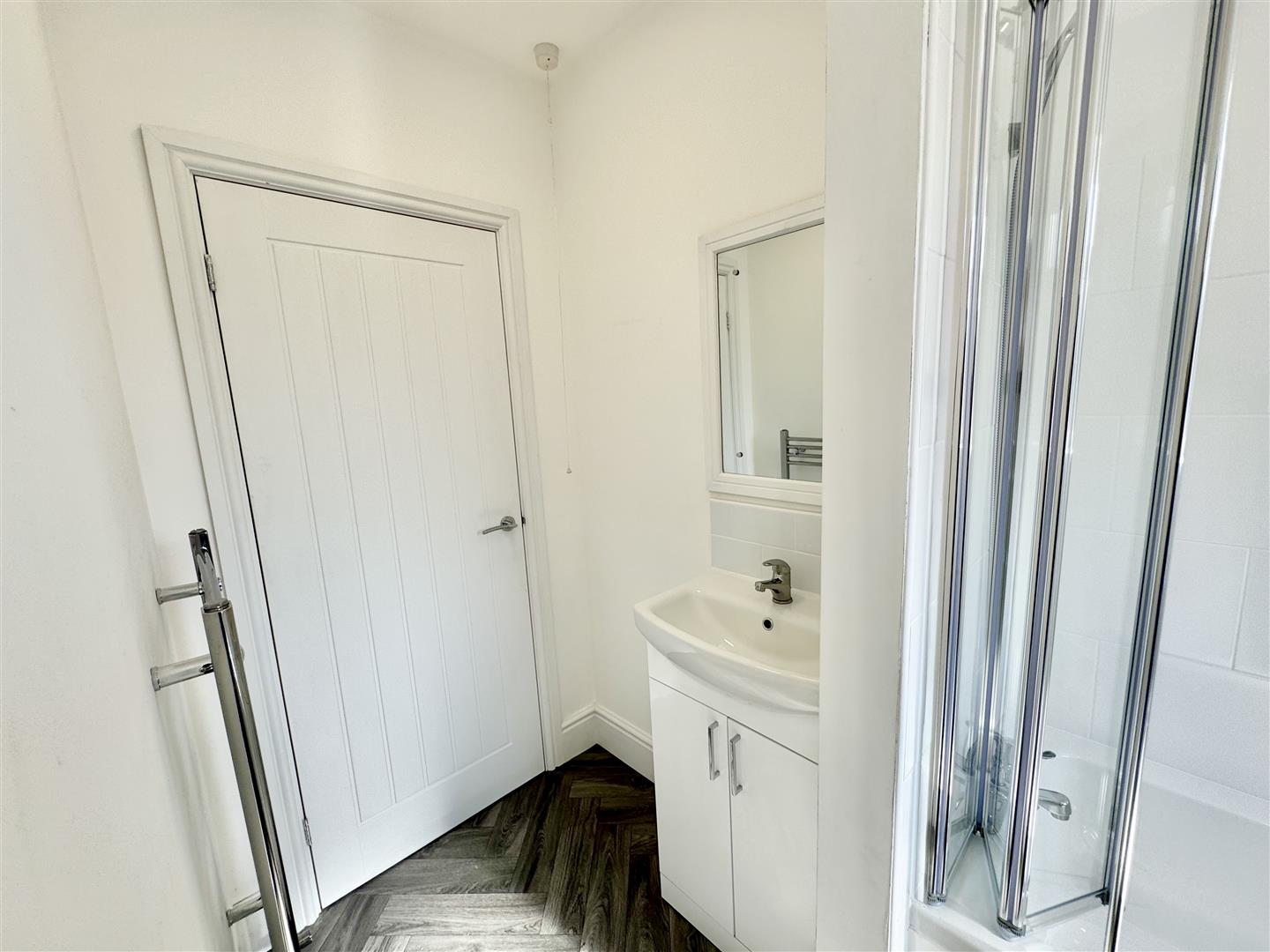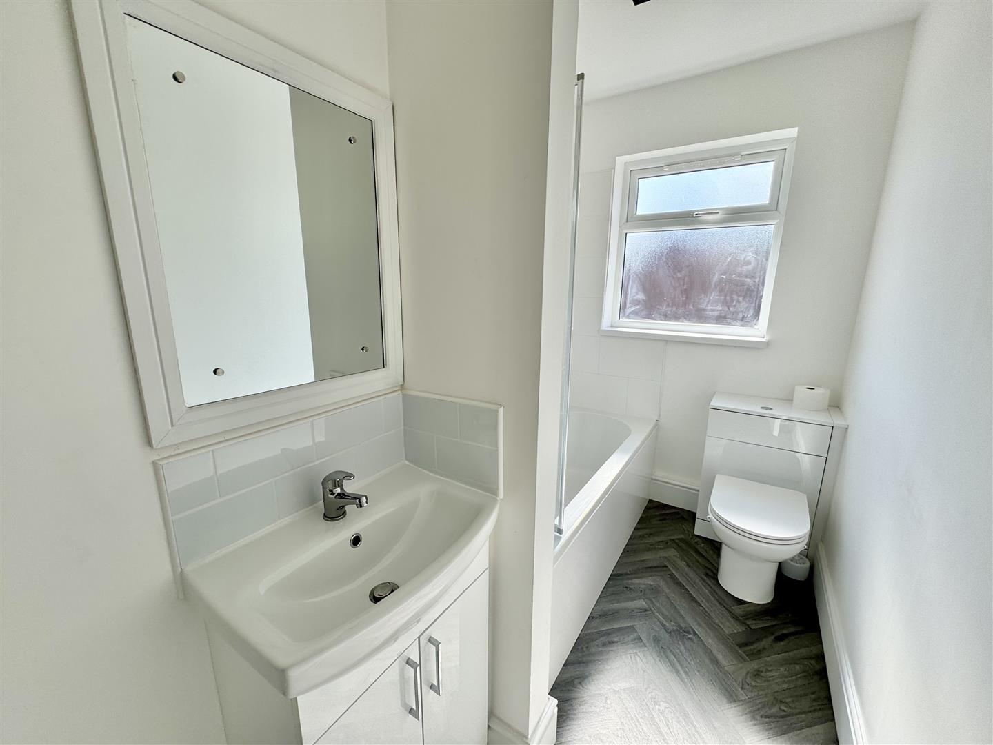 Another room completely refurbished having a three piece suite in white consisting of a panel bath with mixer tap and shower attachment, low level WC and vanity wash basin with mixer tap and storage under. There is white tiling to splash areas, a chrome ladder towel radiator and double glazed window with obscure glass. There are two low energy ceiling lights, vinyl flooring and an internal door leads to the landing.
