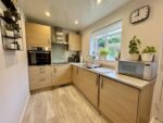 Modern kitchen, located at the rear of the property and having a good range of wall and base units with a light oak finish, complimentary square edged worktops with a quartz effect finish with matching splashbacks and inset stainless steel sink with mixer tap. Integral appliances come in the form of an eye level oven, induction hob with square stainless steel extractor hood over, under counter fridge freezer and washing machine. There is space for a breakfast table, laminate flooring runs underfoot and a low maintenance ceiling with inset spotlights. The double glazed window to the rear overlooks the patio and brings in natural light, there is a kick panel heater and a part glazed composite door allows access to the rear garden space.