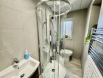 Stylish shower room having a three piece suite in white consisting of a circular shower enclosure with overhead rain shower and separate hose, vanity wash unit with mixer tap and storage and close coupled WC. There is tiling to the walls to full height, a chrome towel radiator, low maintenance ceiling with inset spotlights with natural light coming in from the double glazed window with obscure glass. There is an extractor fan and an internal door leads to the landing.