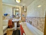 Stylish bathroom having a three piece suite in white consisting of a panel bath with electric shower over, pedestal wash basin and low level WC. There is tiling on the walls to full height, a wall mounted radiator and vinyl flooring. A double glazed window with obscure glass brings in natural light, there is a cupboard for storage and an internal door leads to the landing.