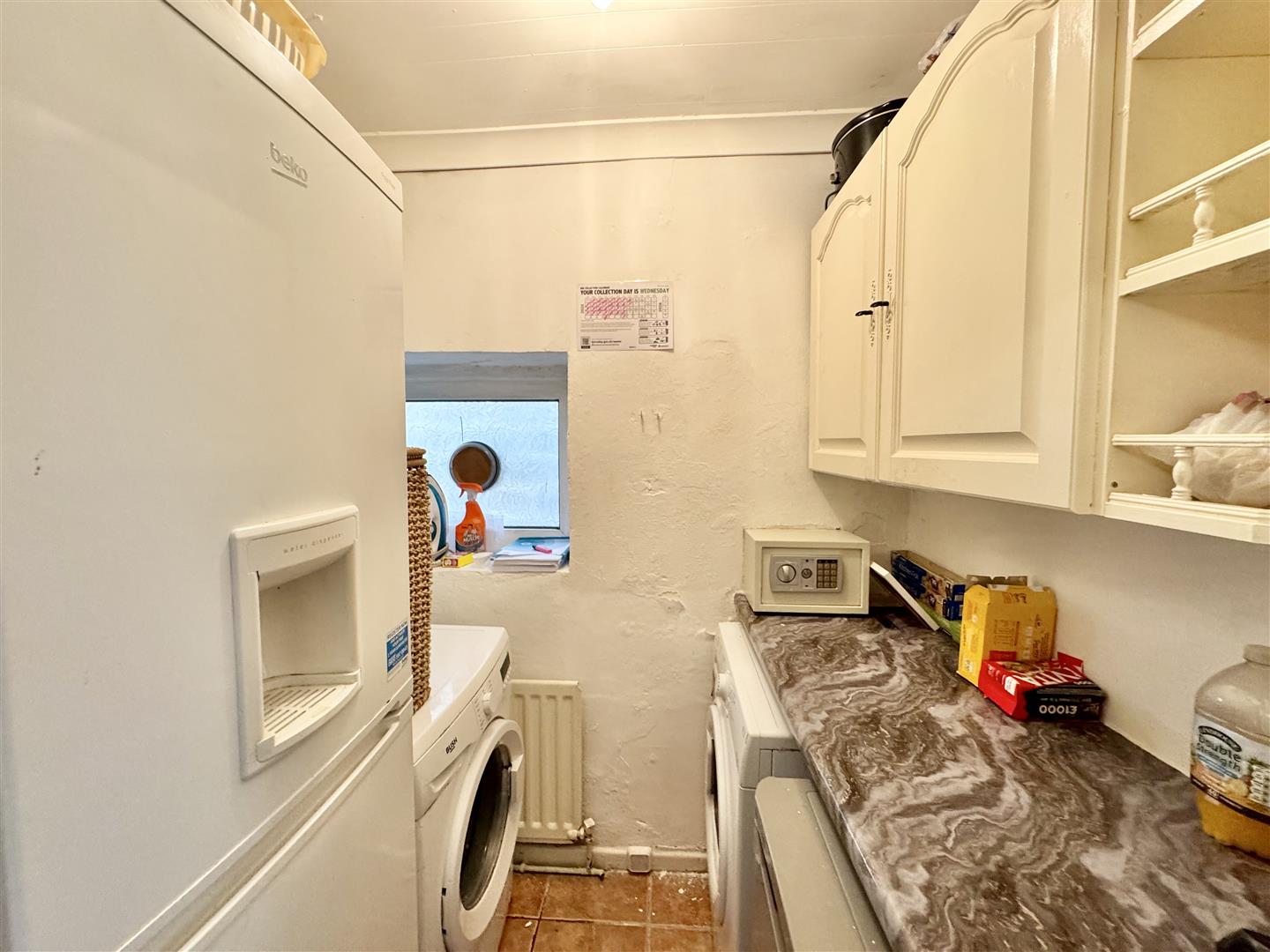 Convenient extra room having kitchen units, complimentary worktop, plumbing for a washing machine and space for an under counter freezer and an upright fridge freezer. A double glazed window with obscure glass brings in natural light, there is a wall mounted radiator and tiled flooring. The boiler is located here and an internal door leads to the kitchen diner.