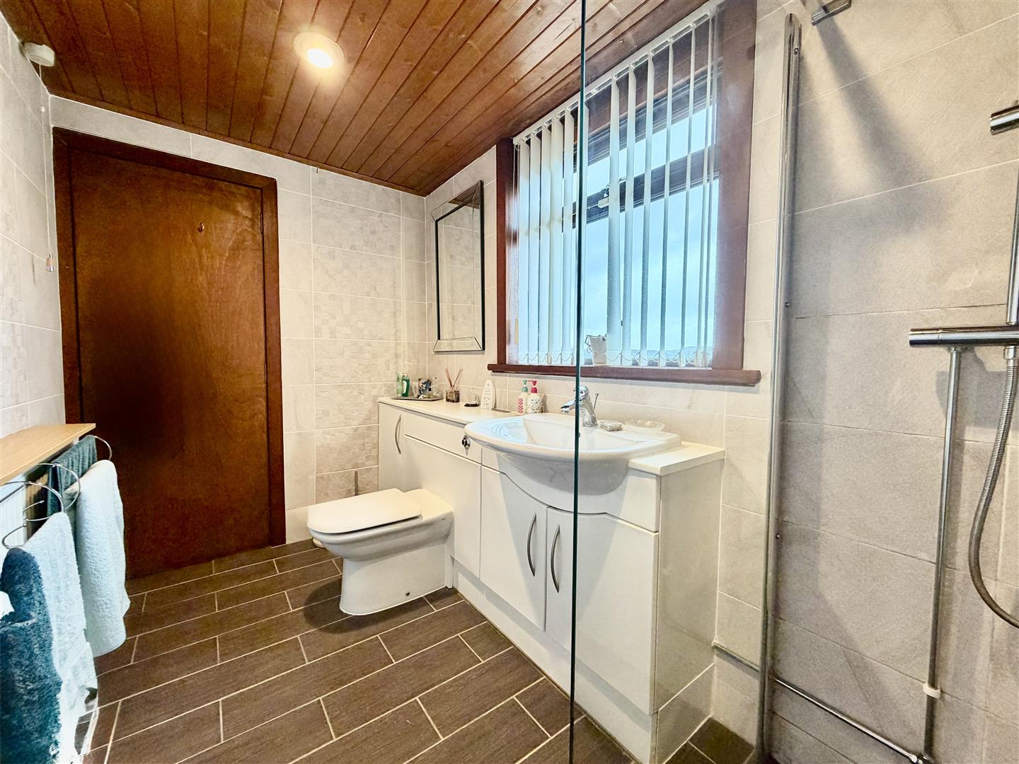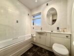 Furnished with a three piece modern white suite with full tiled surround and tiled flooring including a low level w.c with vanity unit surround, inset hand wash basin, walk-in shower area and double glazed frosted window to the rear.