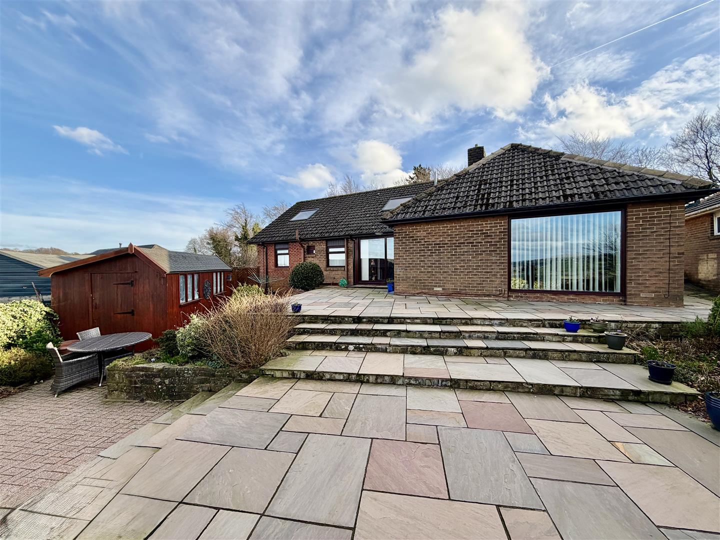 A generous tiered rear garden including an extensive paved patio ideal for summer entertaining and access from the main reception hall with steps down to a good sized lawn with mature borders , further block paved seating area and useful large timber storage shed. The garden enjoys a stunning elevated position with stunning panoramic views towards the Colne Valley and beyond.