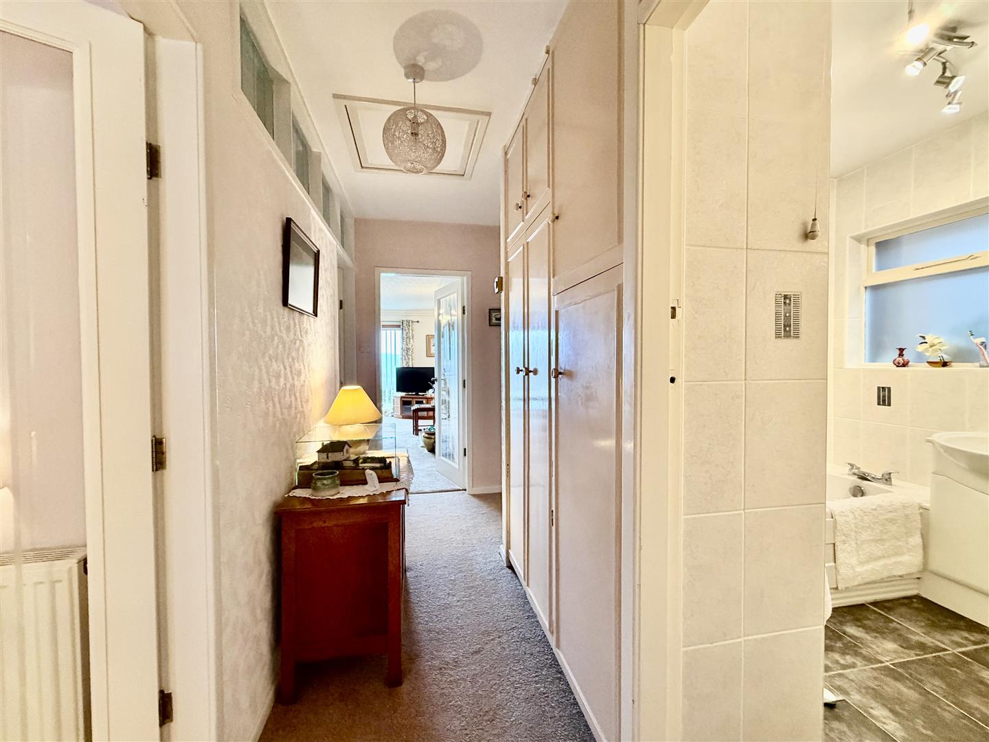 Positioned to the centre of the property with glazed door from main reception hall having fitted cloaks storage cupboard, loft access hatch and doors to all ground floor bedrooms and bathroom.