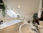 This modern loft bathroom features a three-piece suite in white, complemented by partially tiled walls in a neutral tone. It comprises of a white bath with tiled side panel, pedestal wash hand basin with hot and cold taps and a low-level WC, with a radiator for added comfort. A Velux window allows natural light to flood the room, creating an airy, and welcoming space. Doors lead to the second floor landing.