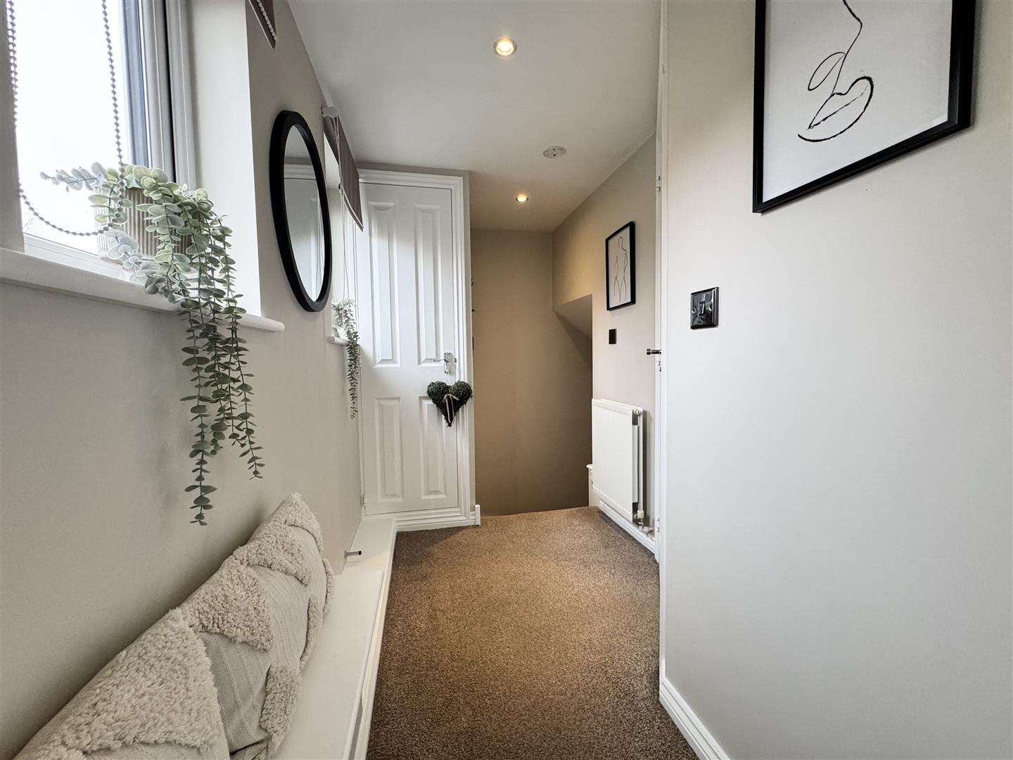 A carpeted staircase with a black-painted balustrade ascends to the first-floor landing, which is bright and airy. A large window overlooking the quiet street fills the space with natural light and there is space for a piece of freestanding furniture.