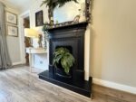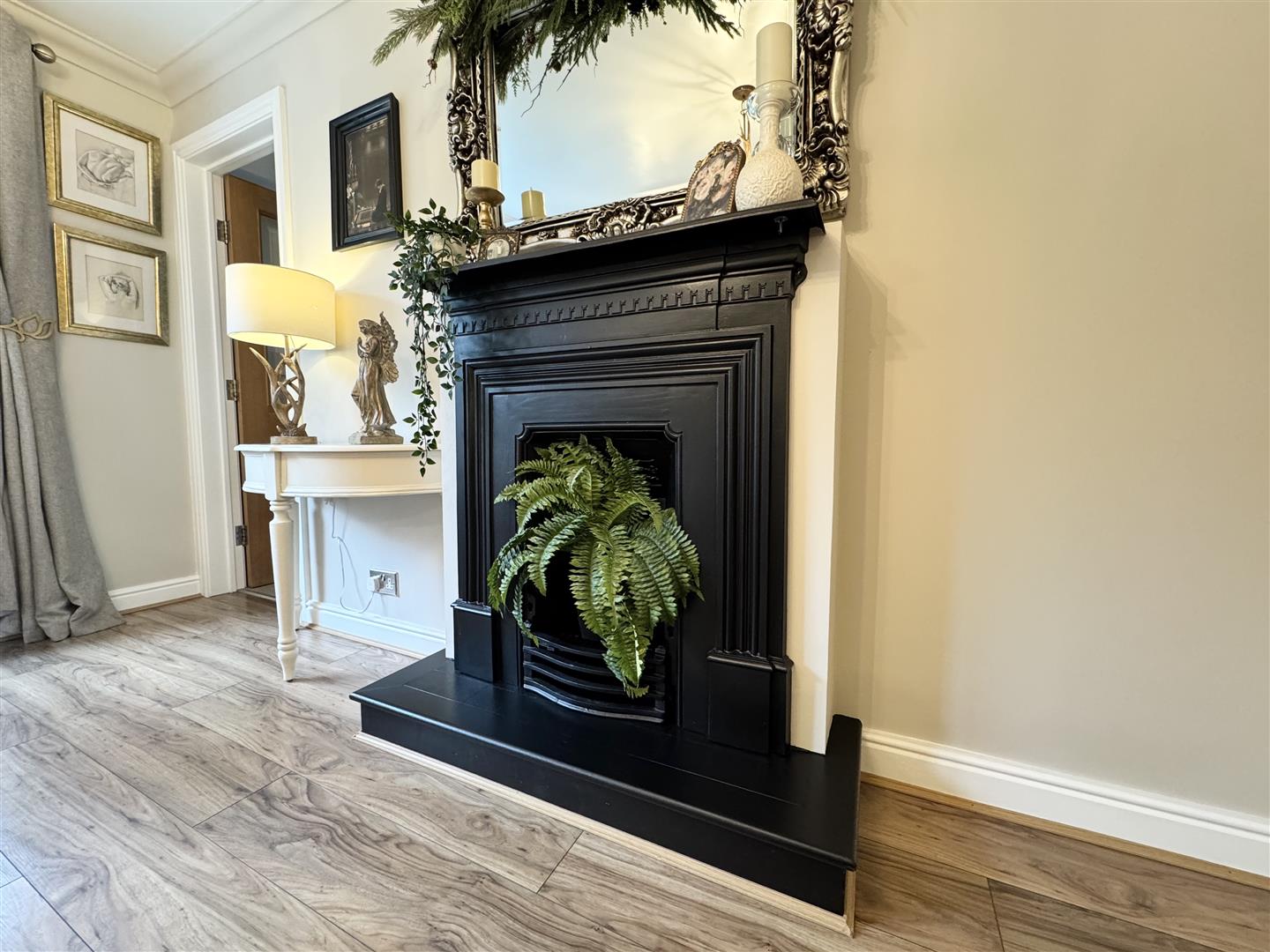 A spacious and beautifully presented lounge positioned at the rear of the property, enjoying a pleasant outlook over the garden through a large window that fills the room with natural light. A charming mock fireplace provides an attractive focal point, enhancing the character and warmth of the space. The room is further complemented by stylish wall lighting, elegant coving, and attractive wood-effect flooring, creating a comfortable and inviting setting ideal for both relaxing and entertaining. Doors lead through to the entrance hall and kitchen.