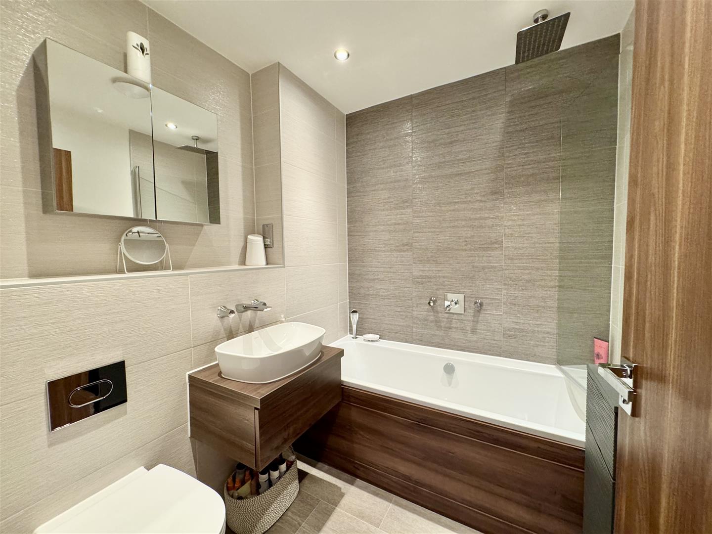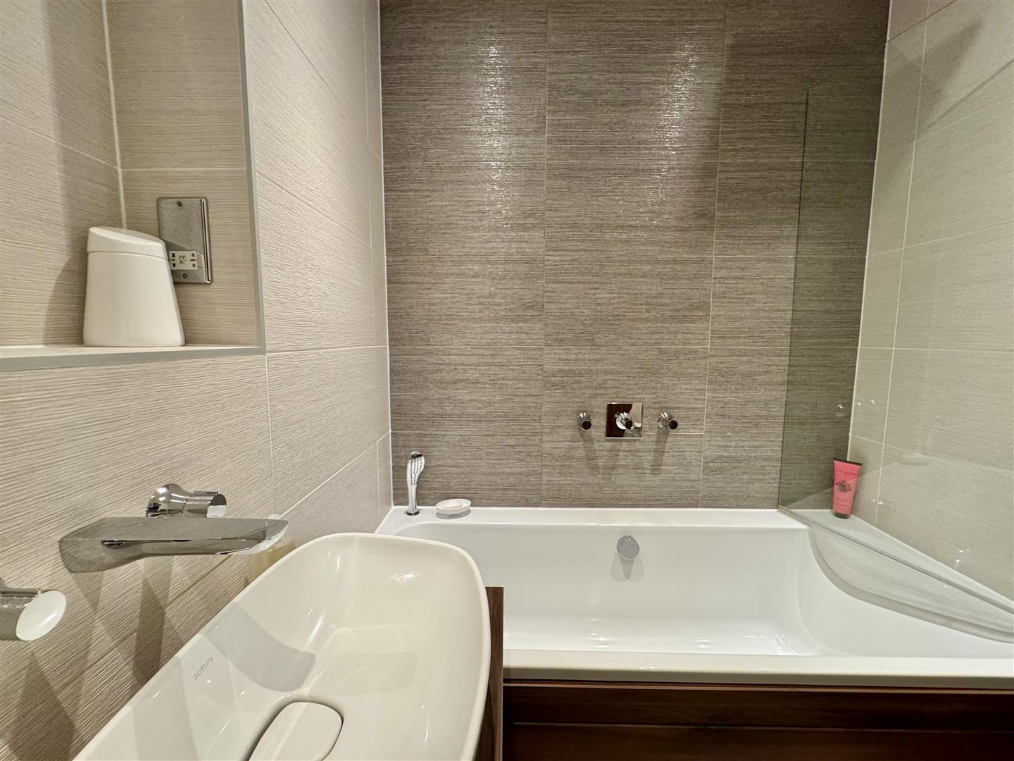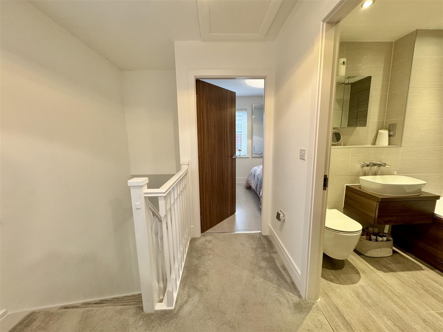 Having a three piece suite in white consisting of a panel bath with concealed wall taps, rain shower over and glass screen plus separate corner retractable hose, wall mounted wash basin with drawer and wall mounted taps and a concealed flush WC. There is a chrome ladder towel radiator, full height tiling to the walls, a vinyl floor, inset ceiling spotlights, shaver point and extractor fan. An internal door leads to the landing.