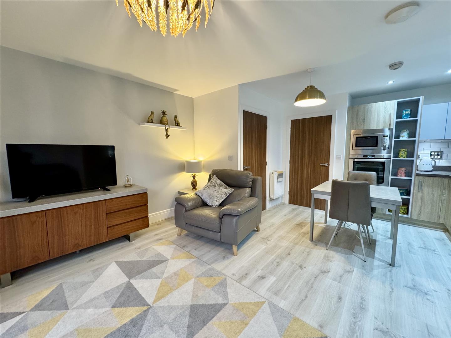 Having an excellent range of wall and base units with a two tone finish, complementary square edged worktops and tiled splashbacks with an inset one and a half bowl stainless steel sink with mixer tap. The many integral appliances include an eye level oven and microwave oven/grill, four ring gas hob with extractor over, fridge freezer and dishwasher. There laminate in this area which flows into the living space, space for a table and chairs and wall mounted radiator. There is also a very convenient utility cupboard which has worktop space, plumbing for a washing machine and gives extra storage space. There are inset ceiling spotlights and an internal door leads to the hall and the space is open to the living area.