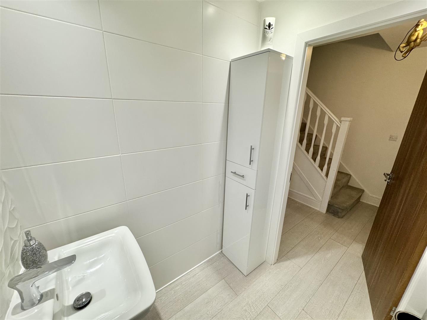 Well proportioned ground floor WC having a two piece suite consisting of a wall mounted wash basin with mixer tap and close coupled toilet. Natural light comes from the frosted double glazed window to the front, there is laminate flooring and full height tiling to two walls. There is a wall mounted radiator, inset ceiling spotlights and an extractor fan. An internal door leads to the hall.