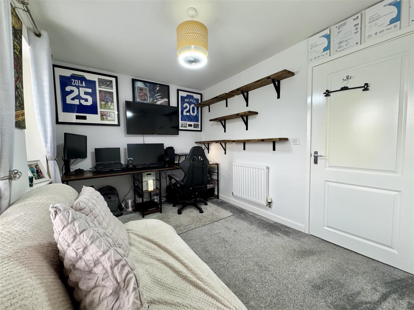 A good size double bedroom, situated at the rear of the property with two double glazed windows giving views of the garden and bringing in plenty of natural light. There is an excellent space for free standing bedroom furniture, carpet flooring and a wall mounted radiator. There is a feature full height panelled wall, pendant lighting and an internal door leads to the landing.