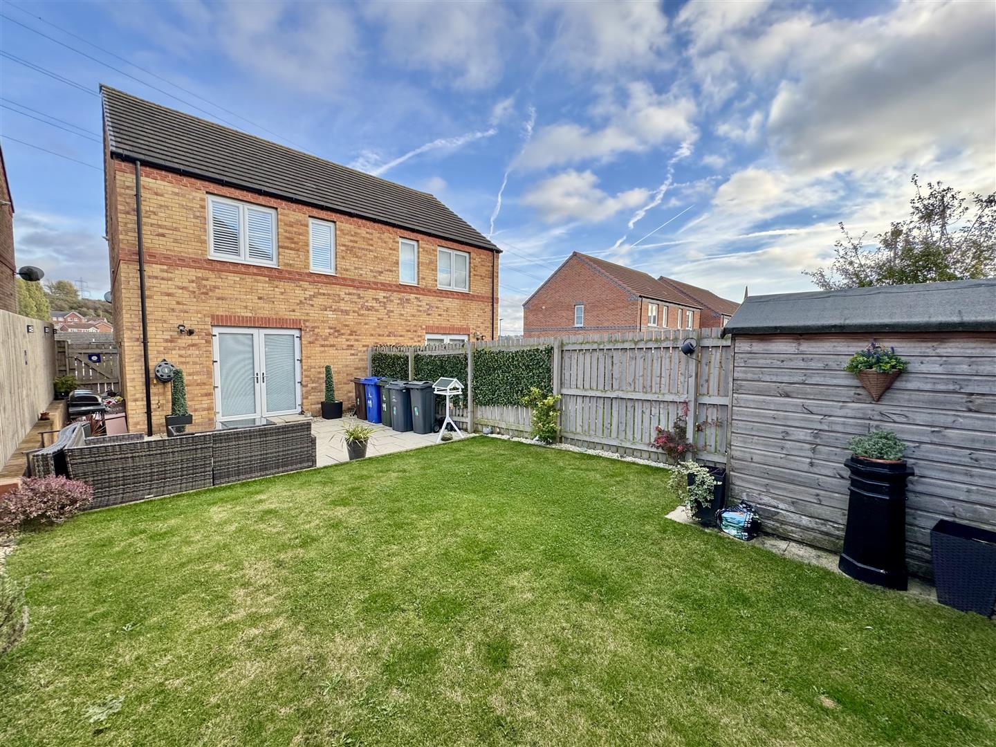 There is off road parking to the front for two cars side-by side, with secure gated side access to the rear garden consisting of a generous sized flagged patio area with floor lights, well maintained lawn and storage shed. There is an outside tap and the are is enclosed a timber fence .