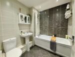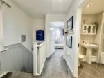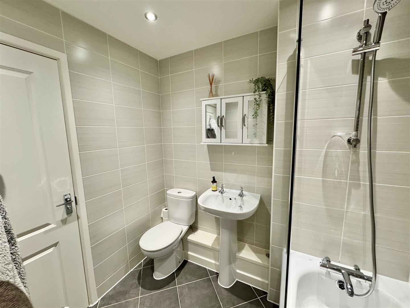 Having a three piece suite in white consisting of a panel bath with thermostatic shower over and glass screen, pedestal wash basin and a twin flush WC. There is a chrome ladder towel radiator, full height tiling to the walls, a tiled floor, inset ceiling spotlights and extractor fan. An internal door leads to the landing.