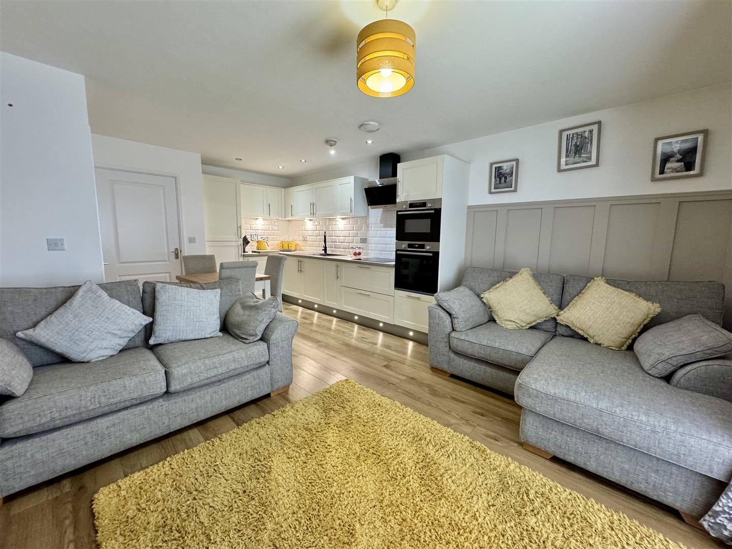 Having an excellent, extended range of wall and base units with a high gloss white finish incorporating plinth LED lights, complementary rolled edged, wood effect worktops, tiled splashbacks and an inset composite sink with mixer tap. The many integral appliances include an eye level oven and microwave/air fryer oven, induction hob with contemporary extractor over and fridge freezer.. There is LVT flooring underfoot, space for a table and chairs and wall mounted radiator. There is also a very convenient utility cupboard which has worktop space, plumbing for a washing machine and gives extra storage space. There are inset ceiling spotlights and an internal door leads to the hall and the space is open to the living area.
