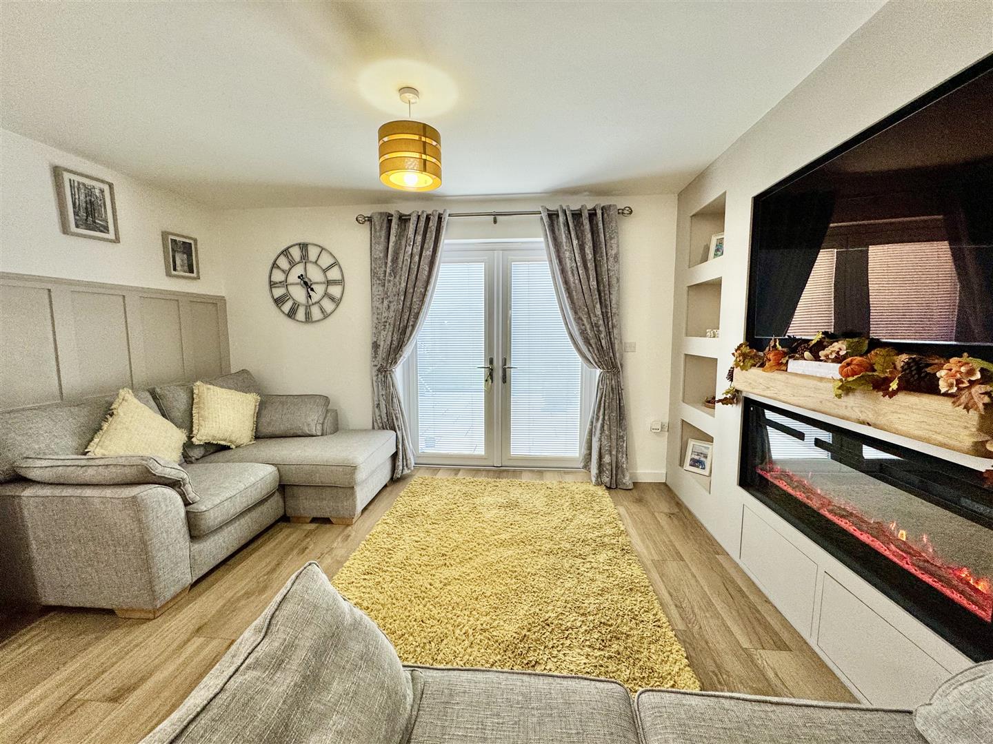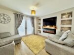 This lovely living area features the magnificent media wall having a contemporary electric fire, storage nooks with lights and cubby storage cupboards. The French doors bathe the whole area with natural light and giving access to the garden. There is LVT flooring, a wall mounted radiator and ceiling lighting.