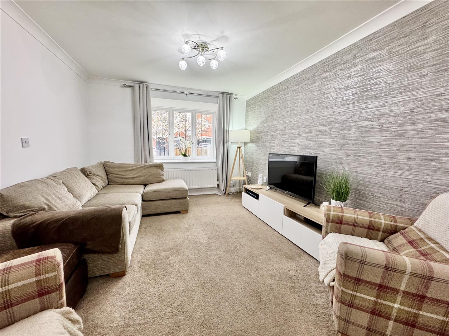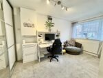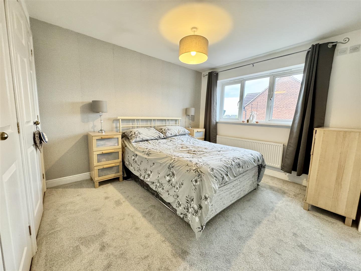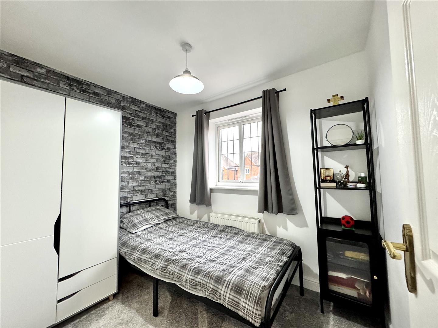 Third bedroom, this time located at the front with the double glazed window bringing in natural light. There is space for freestanding bedroom furniture, carpet flooring, pendant ceiling lighting and a wall mounted radiator. An internal door leads to the landing.