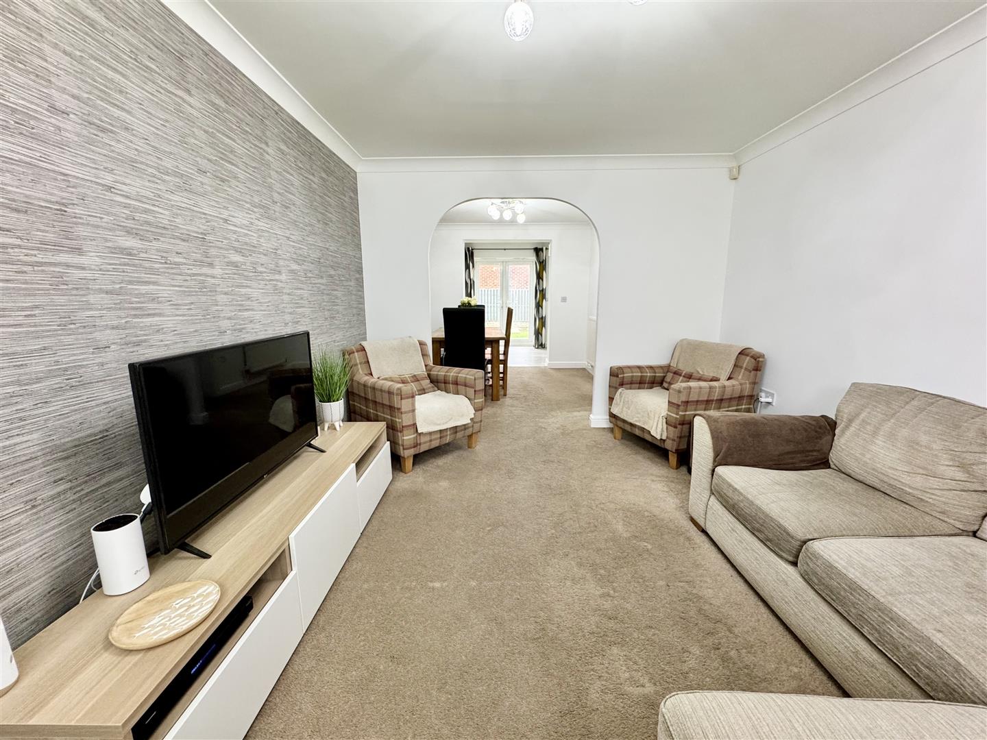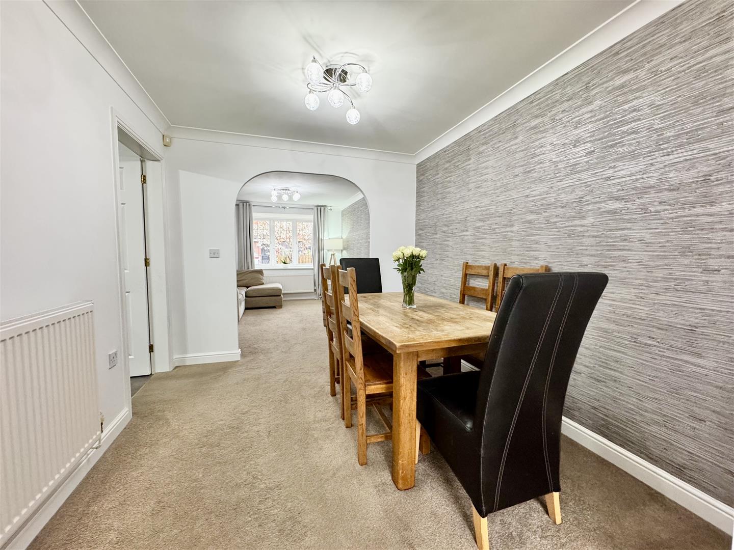 Attractive living room, bathed in natural light via the double glazed bay window to the front. Accessed via the dining room, there is carpet flooring, a wall mounted radiator and coving to the ceiling. An archway leads to the dining room.