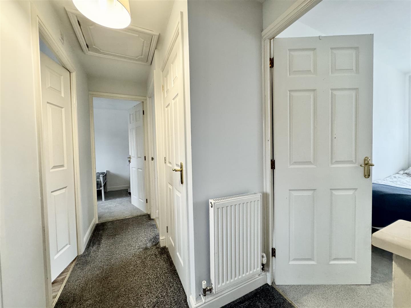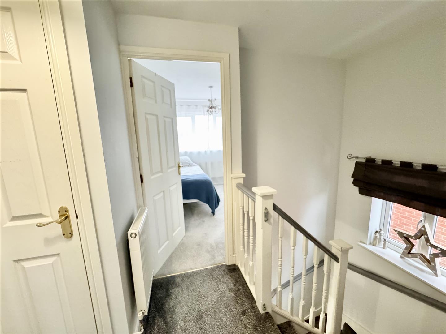 A half turn staircase ascend from the hall to the first floor landing which has carpet flooring, a wall mounted radiator, pendant lighting with a double glazed window bringing in natural light. Internal doors lead to the bathroom and all bedrooms.