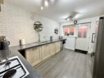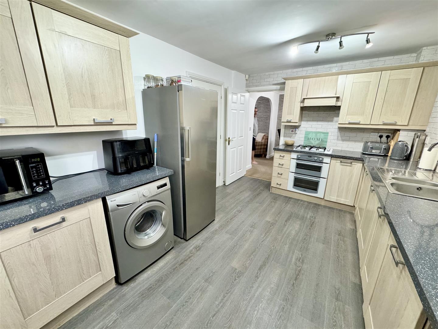 Modern kitchen having an excellent range of wall and base units with a light oak effect finish, square edged worktops and one and a half bowl stainless steel sink with mixer tap. Integral appliances include the electric double oven, four ring gas hob with extractor hood over and dishwasher with space for an upright fridge freezer and plumbing for a washing machine.There is space for a breakfast table, vinyl flooring runs underfoot, there are ceiling spotlights with plenty of light coming in via the double glazed window to the rear which looks out to the garden. A glazed door leads to the side of the property and an internal door takes you to the dining room.