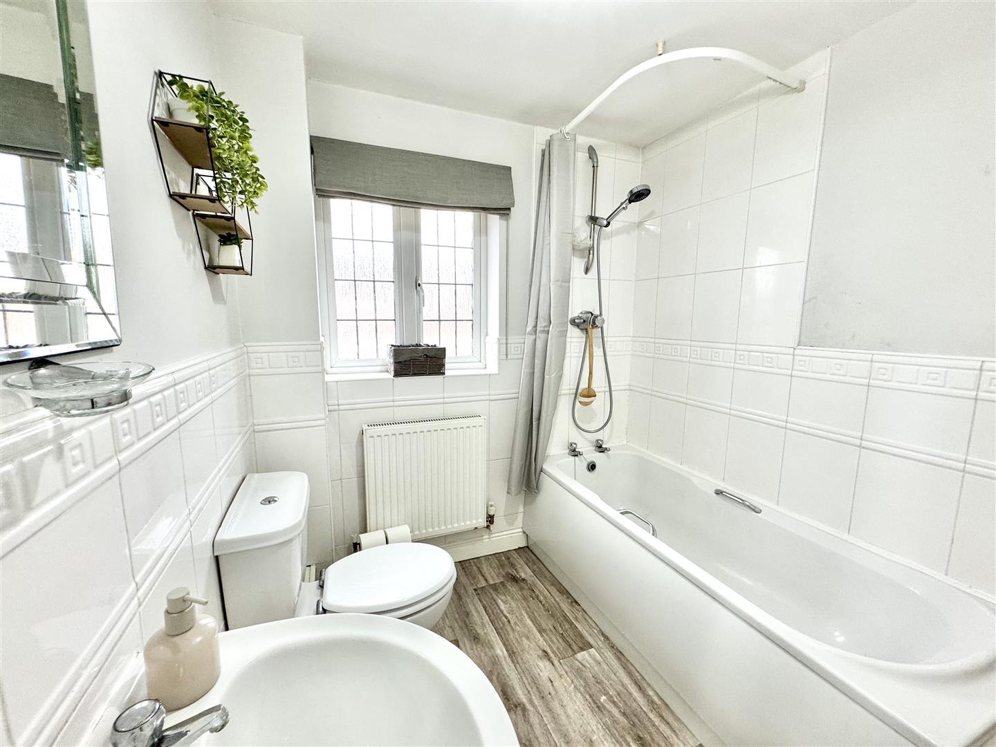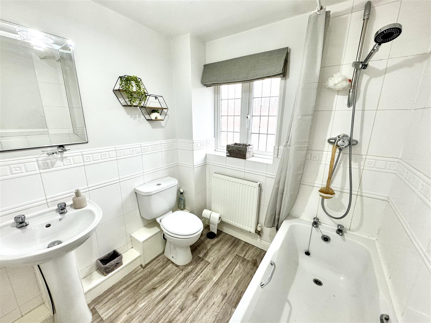 Having a three piece suite consisting of a panel bath with thermostatic shower over, pedestal wash basin and twin flush low level WC. There is vinyl flooring, a wall mounted radiator, ceiling light and a double glazed window with obscure glass brings in natural light. There is an extractor fan and an internal door leads to the bedroom.