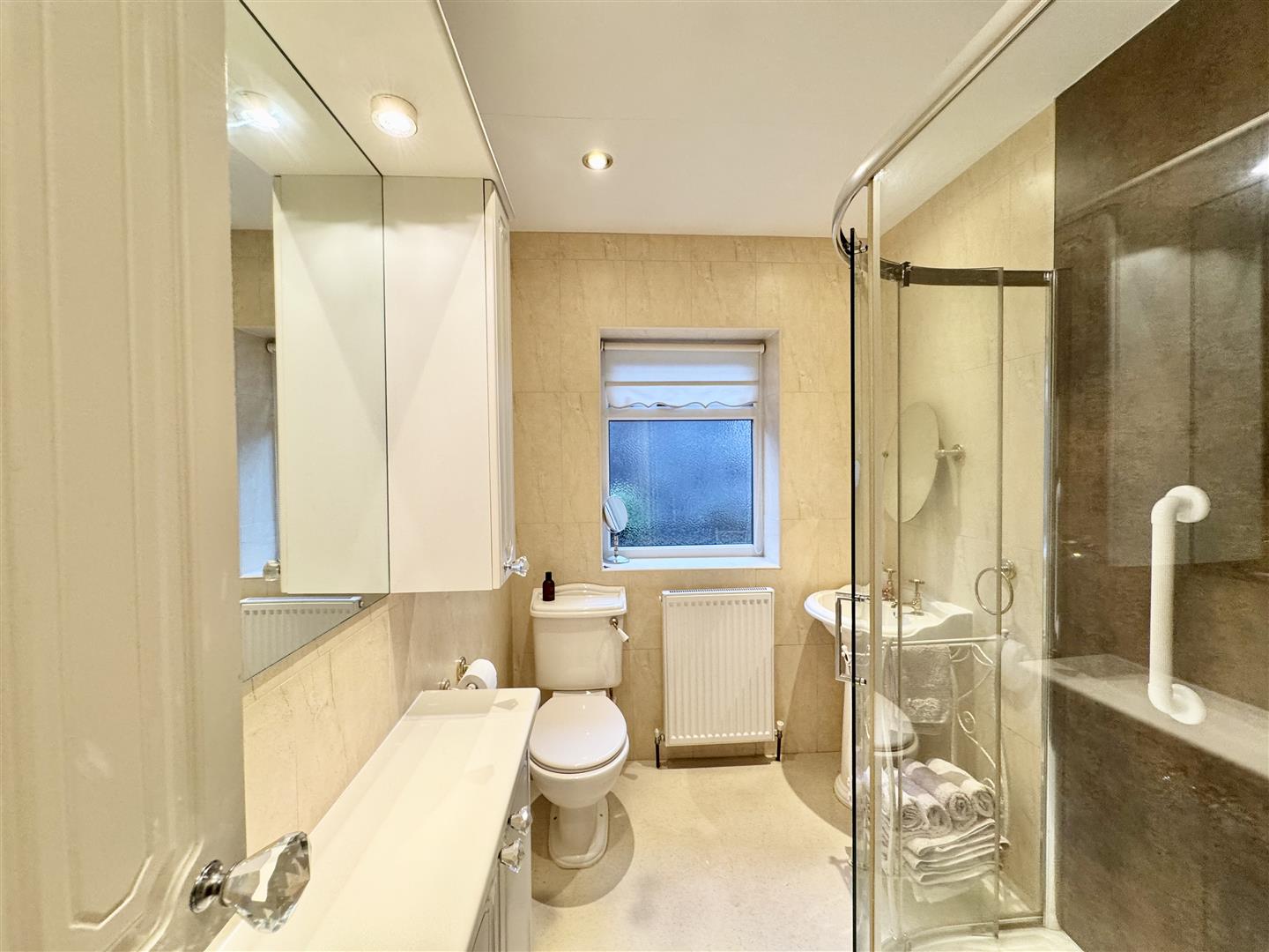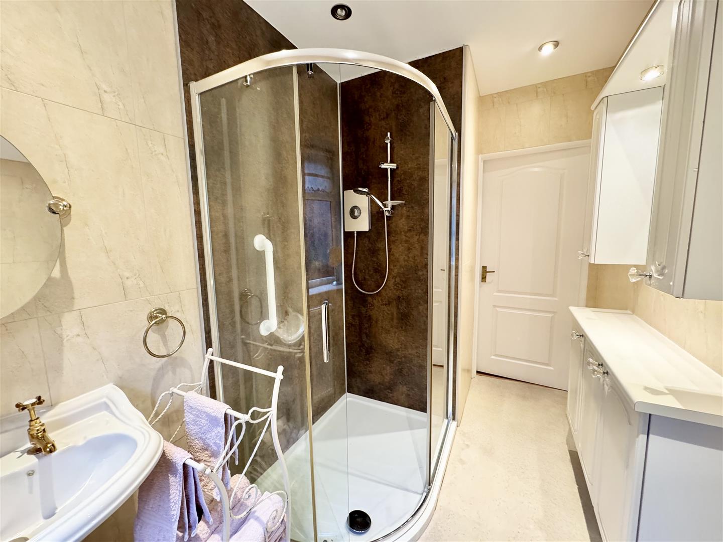 Stylish shower room having a three piece suite in white consisting of a double corner shower cubicle with electric shower, pedestal wash basin and low level WC. There is also a useful wall mounted unit having cupboard, worktop space plus wall cupboard, mirror and LED lights. There is vinyl flooring underfoot, a wall mounted radiator, inset ceiling spotlights and a double glazed window with obscure glass. An internal door leads to the hallway.