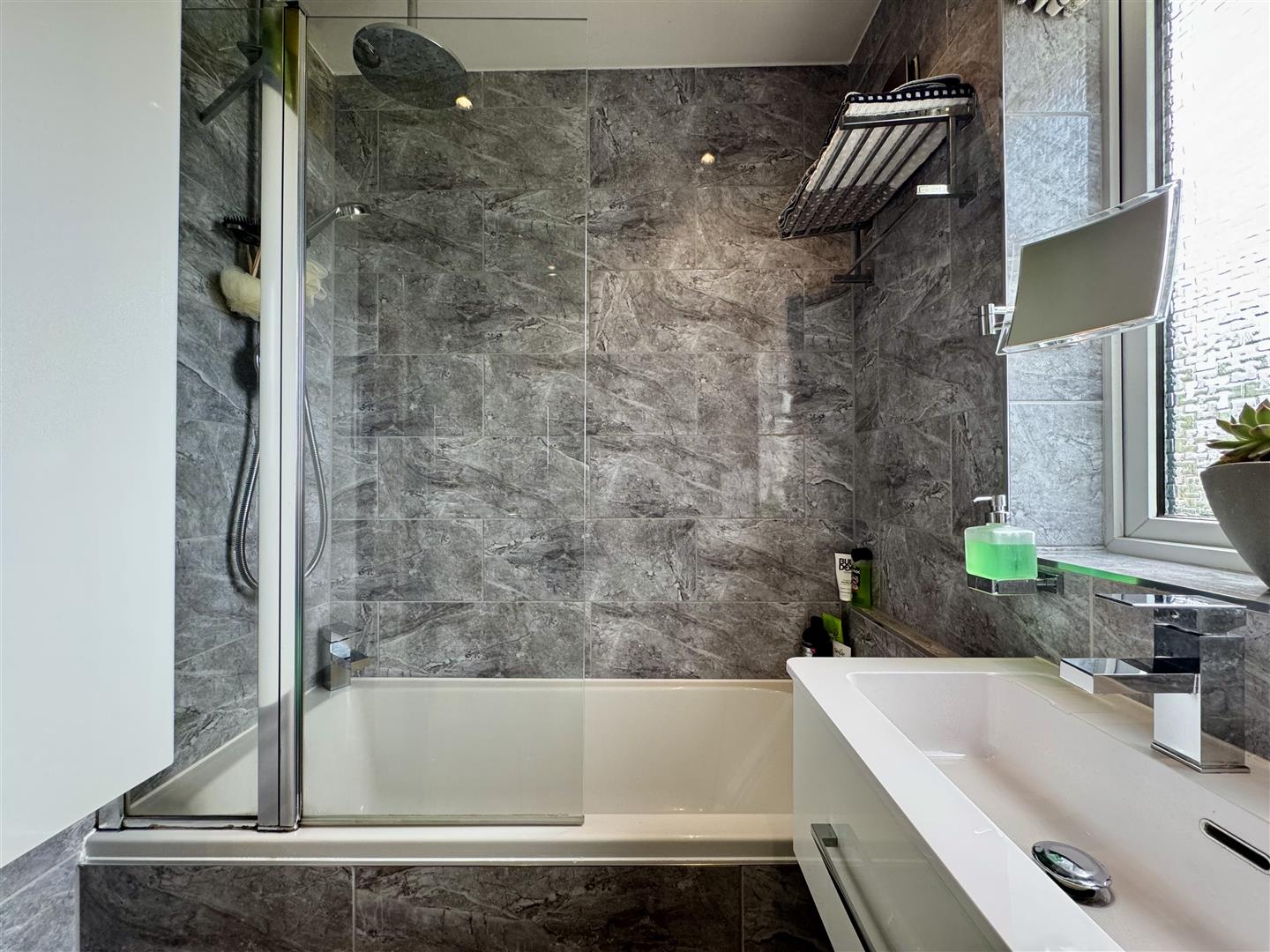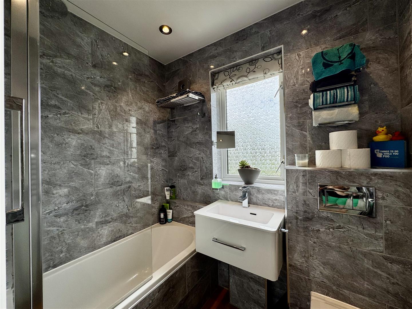 The attractive house bathroom is fitted with a white three-piece suite, including a bath with waterfall shower and glass screen, a wall hung vanity hand wash basin and a low level W.C. The room is fully tiled, has laminate flooring underfoot, a chrome towel radiator, obscure glazed window and a door leads through to the first floor landing.