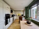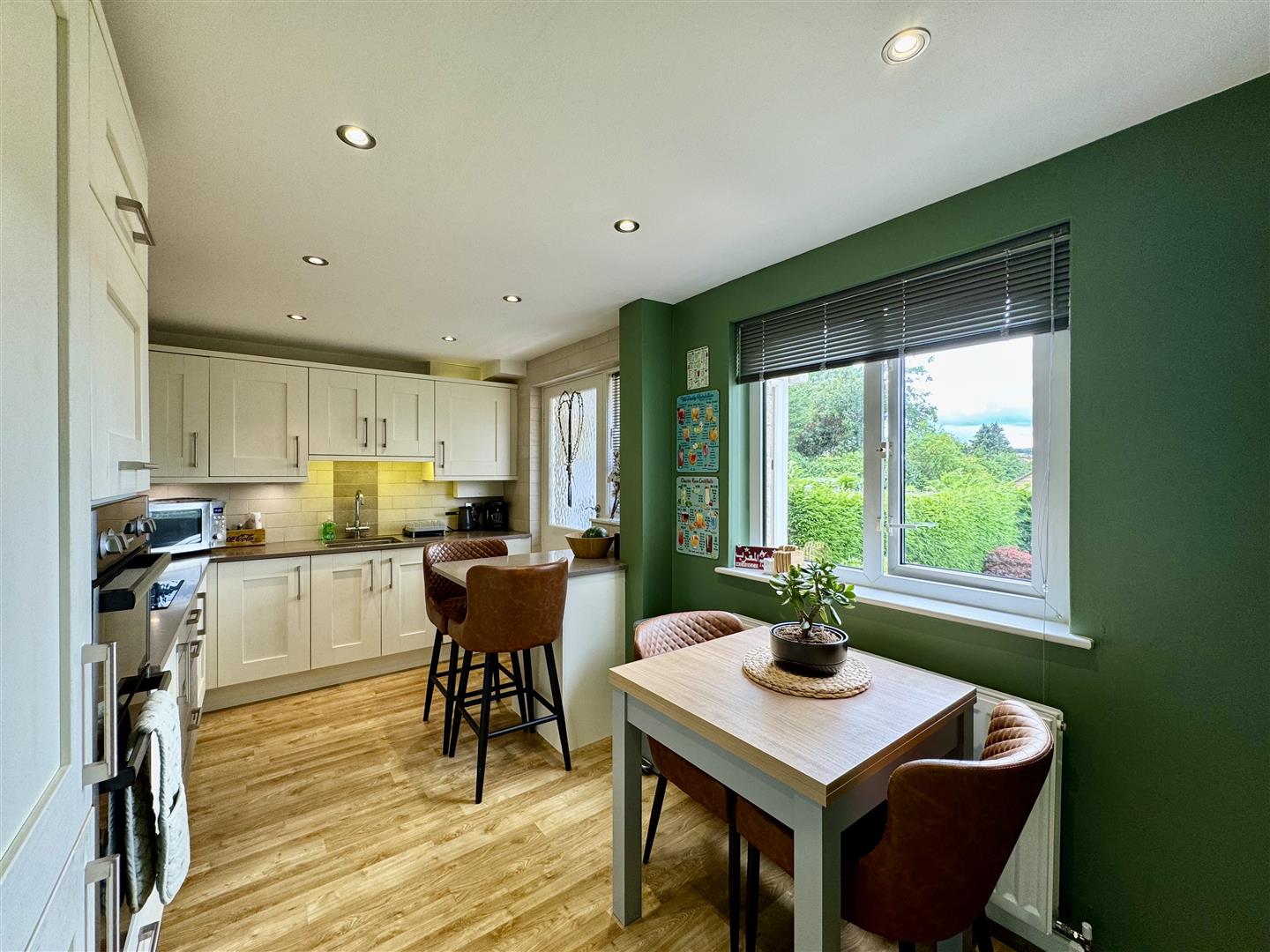 Flooded with natural light through its windows and having lovely garden views is this stylish dining kitchen which is fitted with a range of cream wall and base units, complimentary work surfaces with tiled upstands and an inset stainless steel sink with mixer tap over. Integrated appliances include a double electric oven and four ring induction hob with extractor fan over, fridge freezer, dishwasher and washing machine. To the side of the kitchen is a breakfast bar ideal for informal dining and space for a dining table with chairs. Spotlighting to the ceiling and laminate flooring completes the room, a door opens to the rear porch and a door leads back through to the living room.