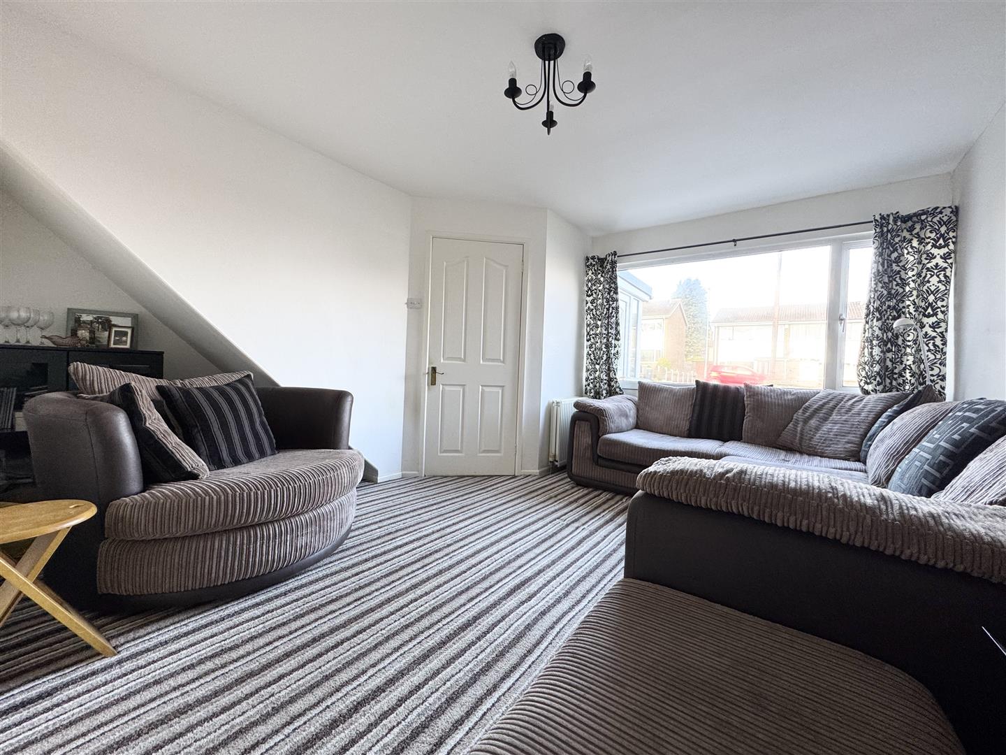 A door leads through to the entrance hallway which has a carpeted staircase ascending to the first floor and an angled door leading to the lounge.