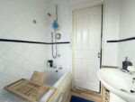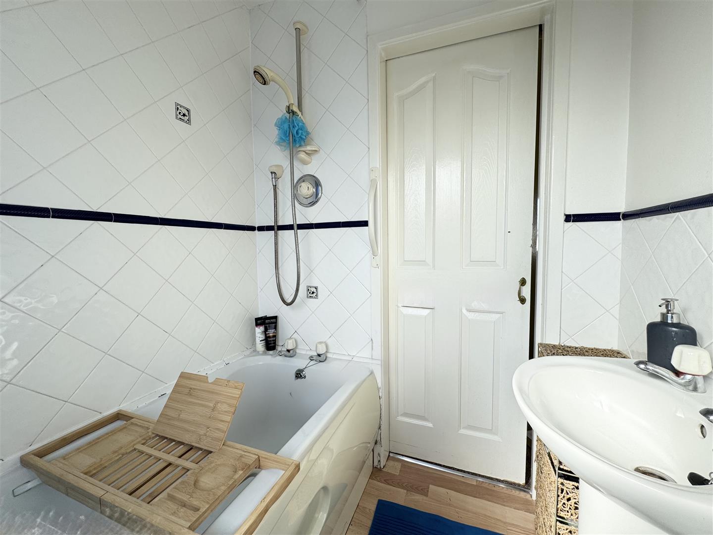 The bathroom is fitted with a white three piece suite comprising a bath with a thermostatic mixer shower over, a pedestal hand wash basin and a low level WC. White tiles with a blue border adorn the walls and there is wood effect vinyl flooring underfoot. An obscure window allows natural light to enter and a sliding door leads to the landing.