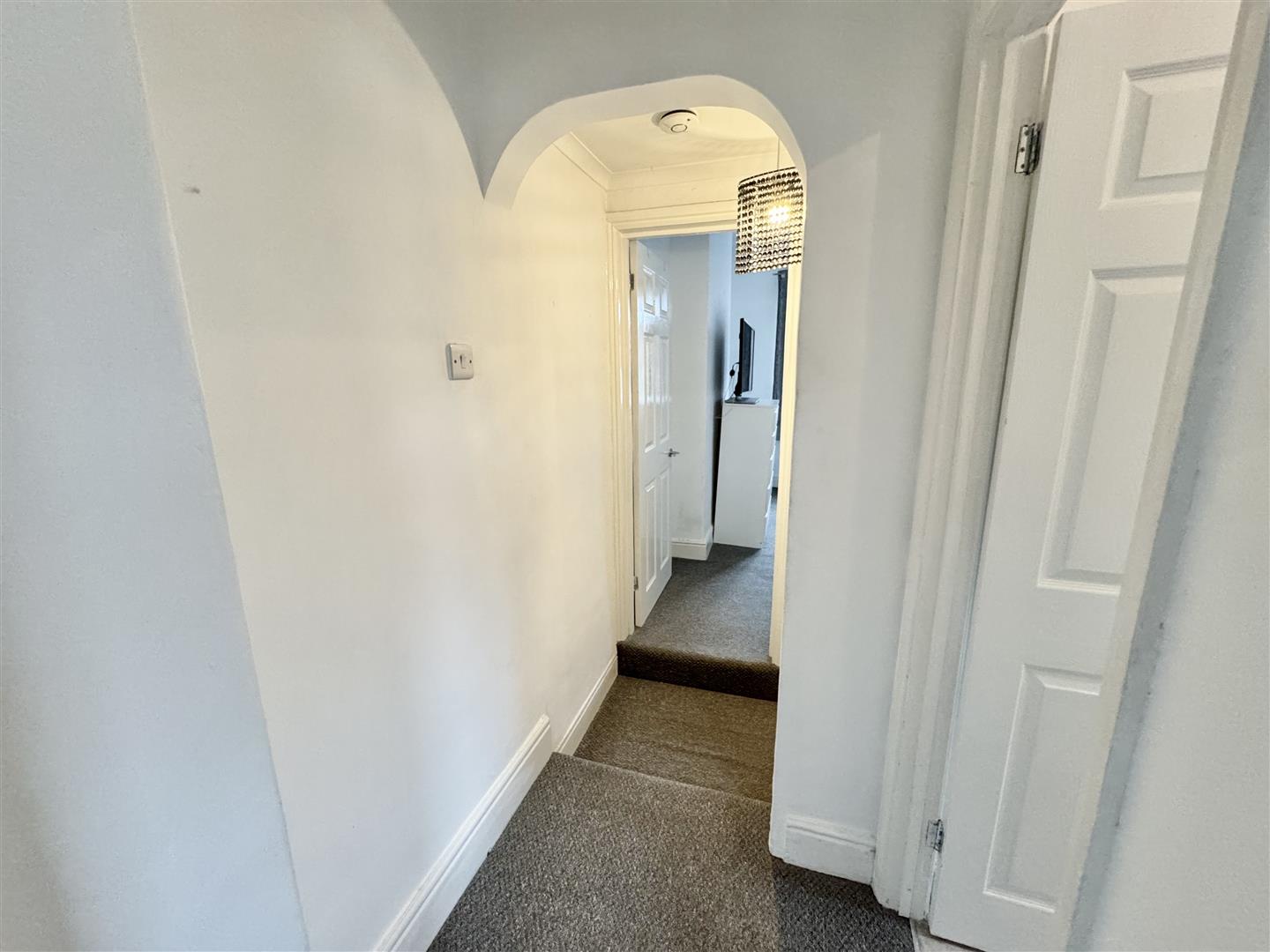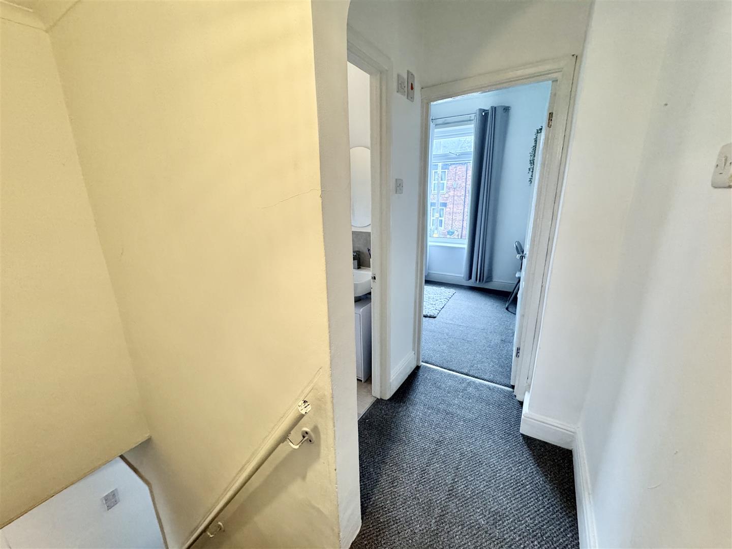 This split level landing has carpet flooring and gives access to the bathroom and both bedrooms.