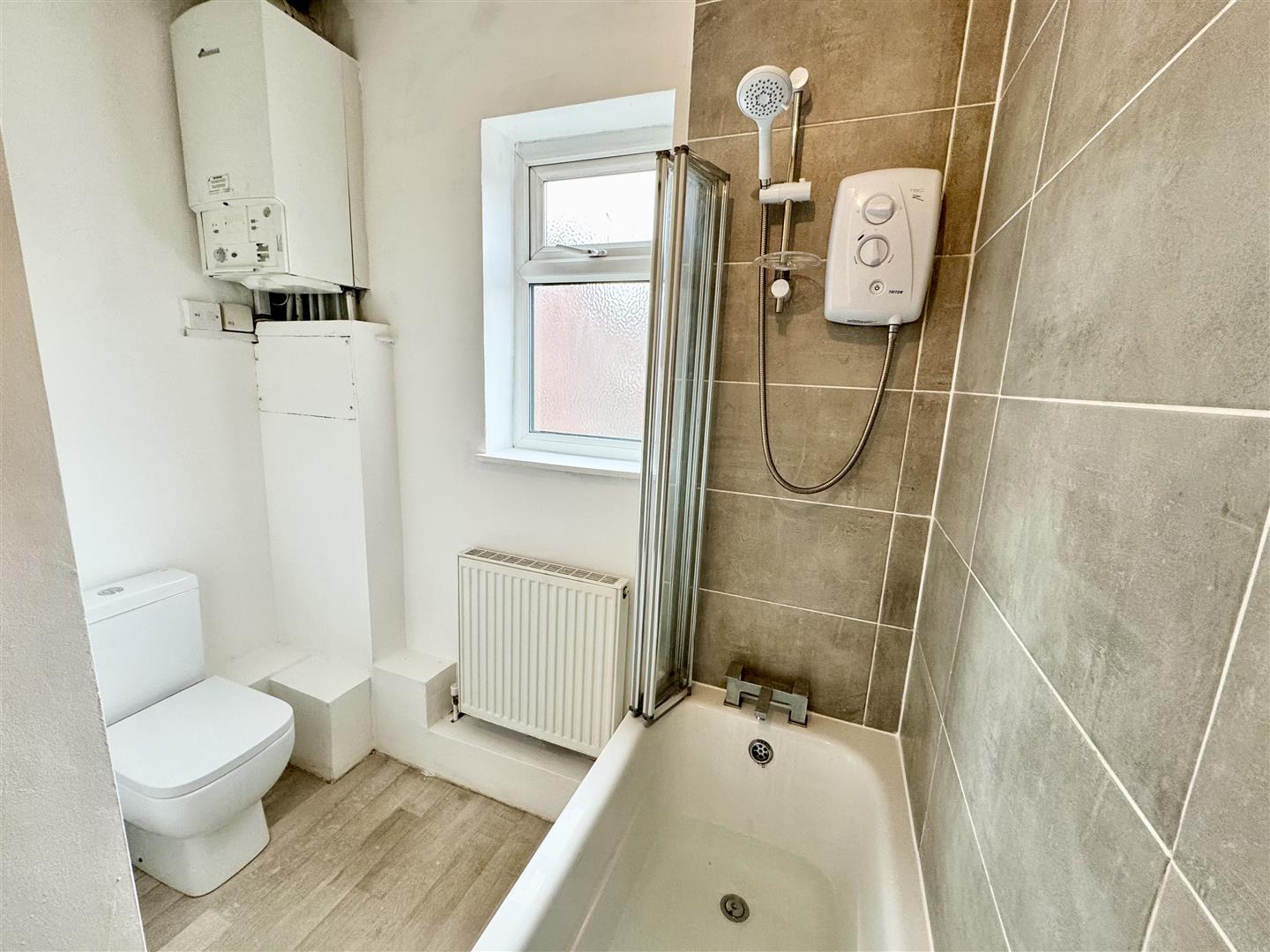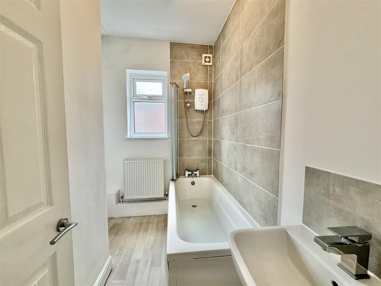 Having a thee piece suite in white consisting of a panel bath with mixer tap, electric shower over and bi-fold shower screen, a pedestal wash basin with mixer tap and twin flush low level WC. There is a wall mounted radiator, ceiling spotlights, a double glazed window with obscure glass and vinyl flooring runs underfoot. There is access to the loft space and an internal door leads to the landing.
